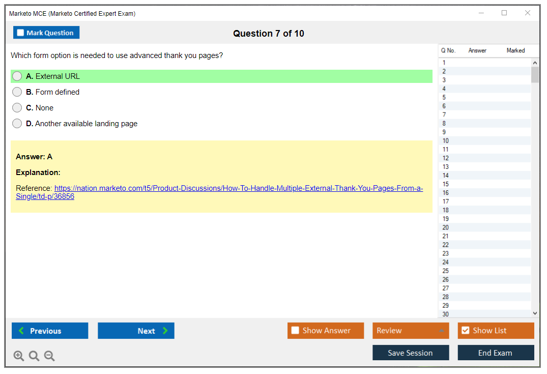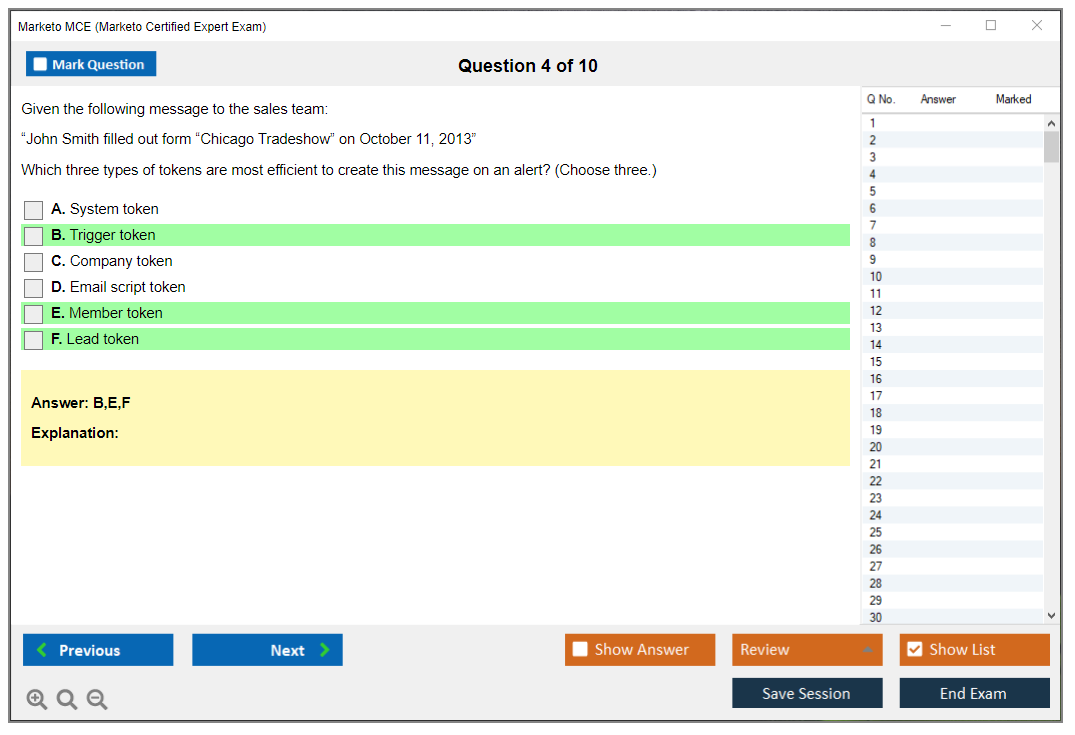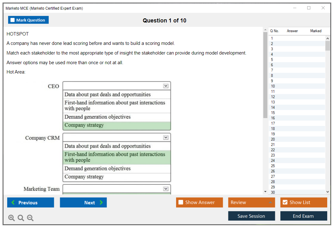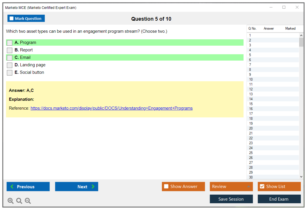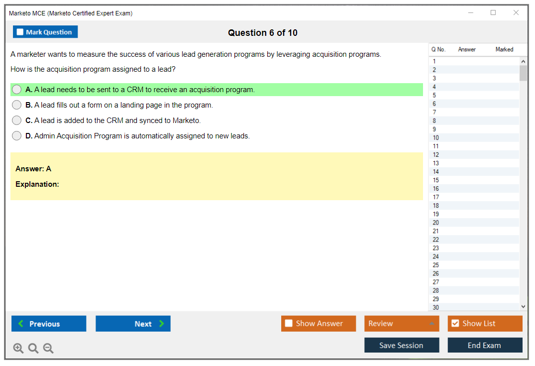 The Marketo Certified Expert (MCE) Exam is a certification exam designed to validate the expertise of professionals who use Marketo, a leading marketing automation platform. The exam tests the candidate's knowledge and skills in using Marketo to manage marketing campaigns, lead management, and other key functionalities.