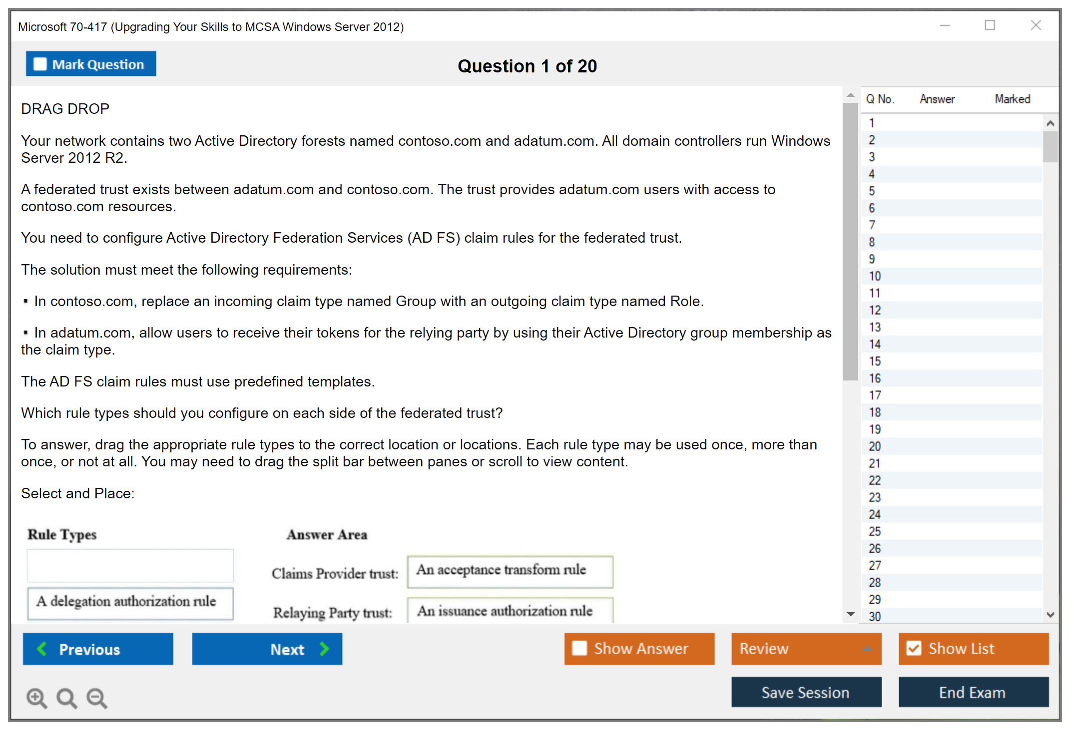 The question format of the Microsoft 70-417 exam includes multiple-choice, drag-and-drop, and simulation questions.