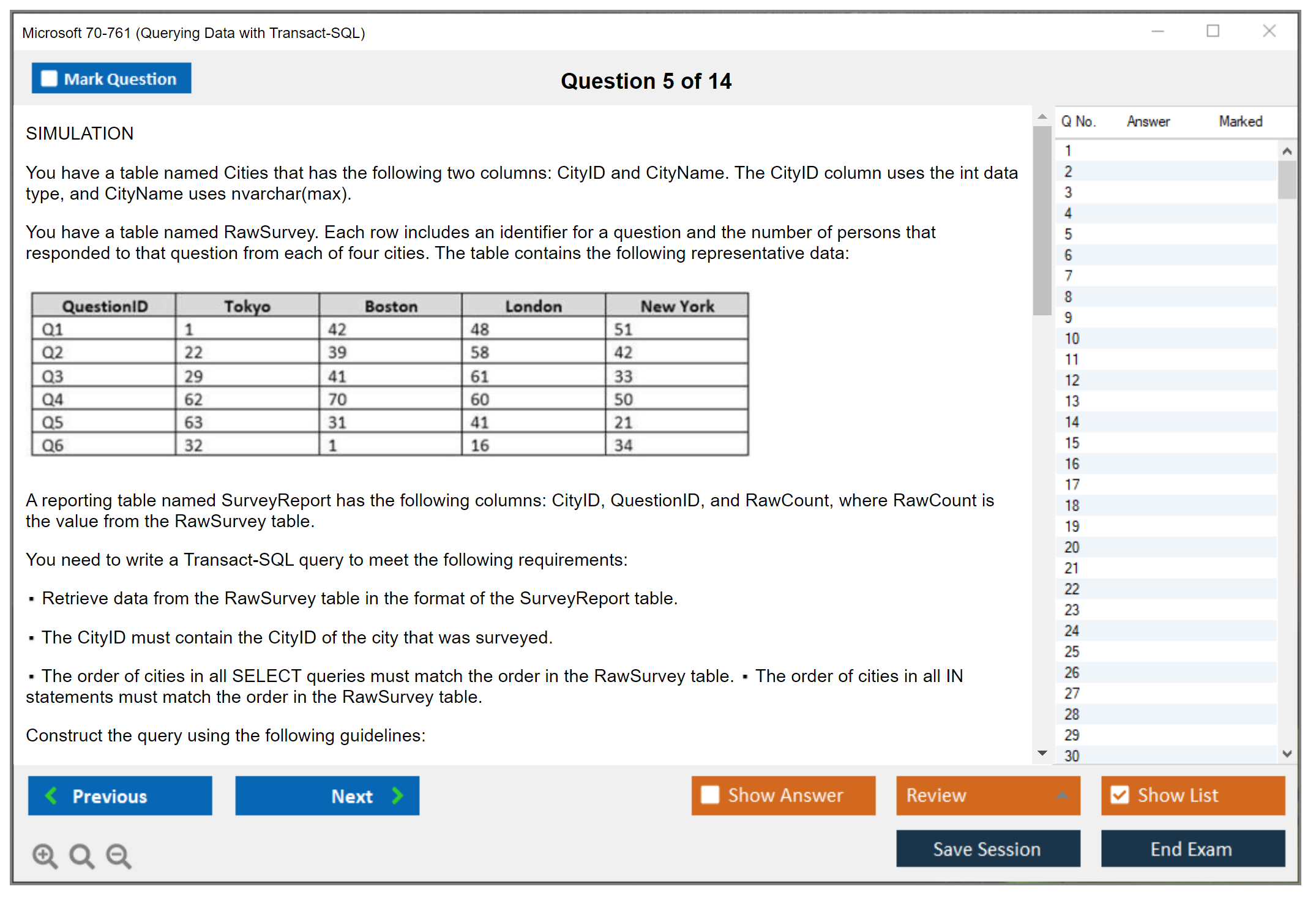 The Microsoft 70-761 (Querying Data with Transact-SQL) Exam is designed to test the skills and knowledge required to query data using Transact-SQL, which is a proprietary extension to SQL used by Microsoft SQL Server. This exam covers core data management tasks, including querying multiple tables, managing data with Transact-SQL, and programming databases.