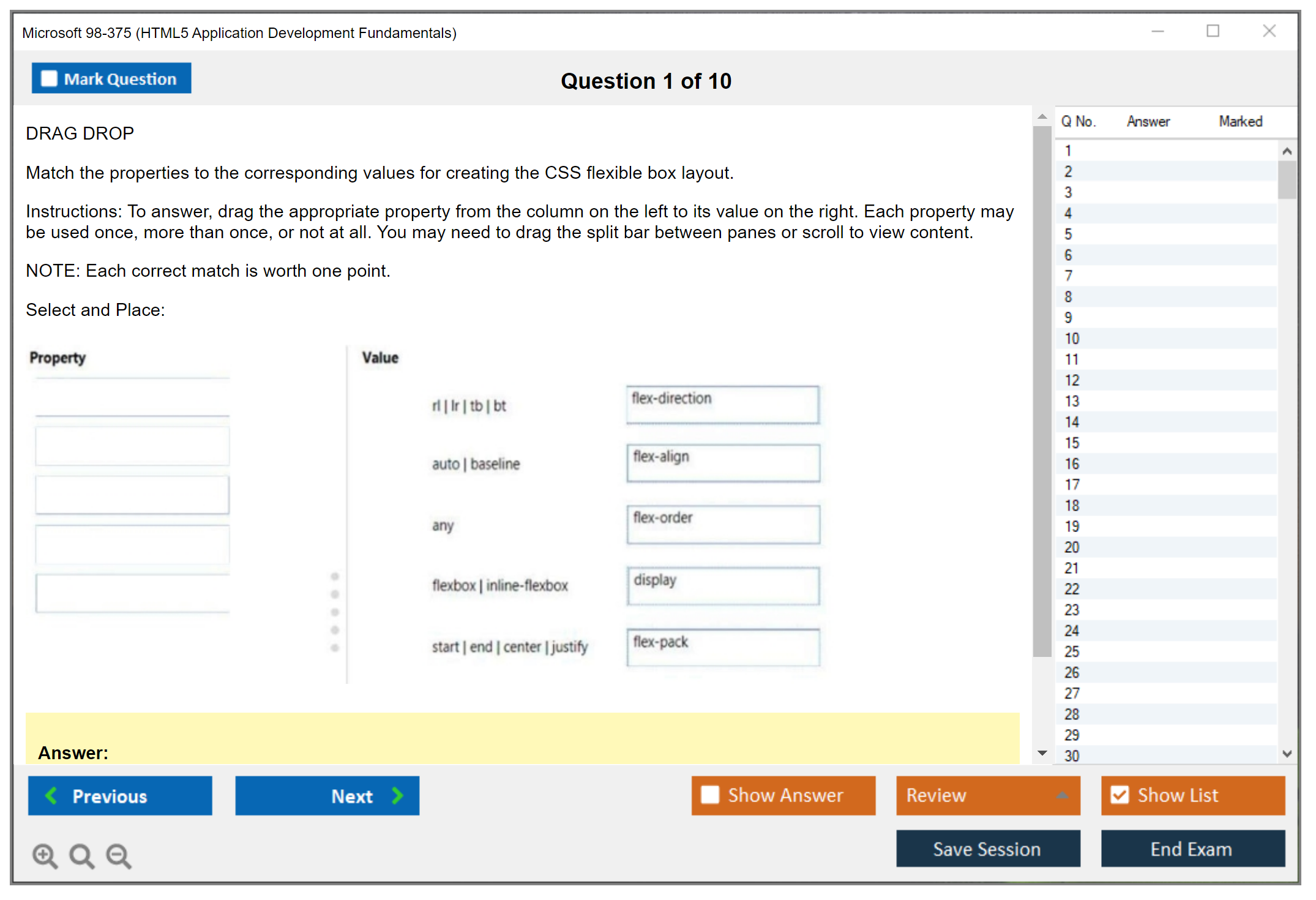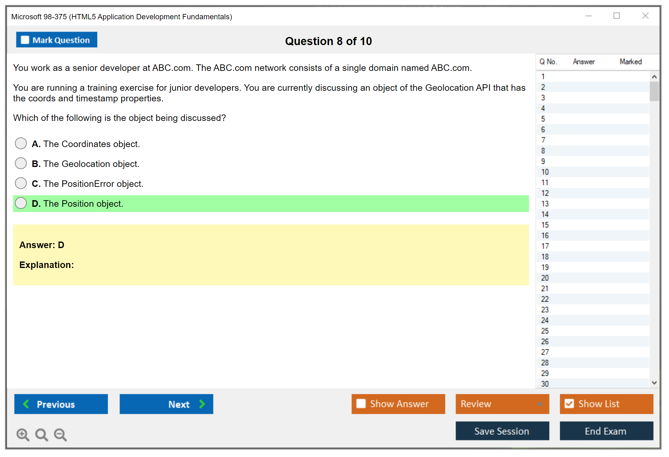 The Microsoft 98-375 (HTML5 Application Development Fundamentals) exam is designed to test the candidate's knowledge and skills in developing applications using HTML5, CSS3, and JavaScript. It covers fundamental concepts of HTML5-based application development.