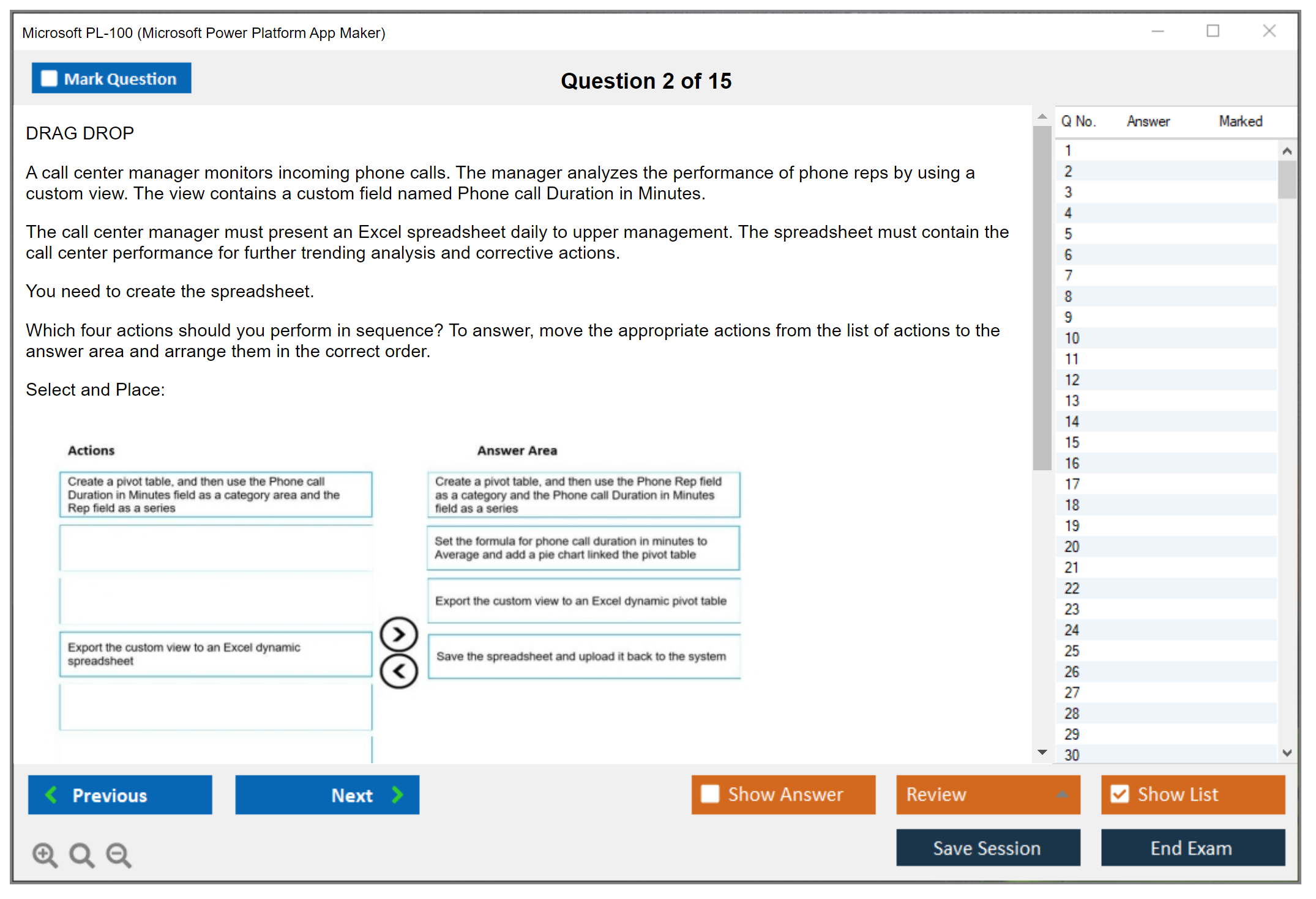 The question format of the Microsoft PL-100 Exam includes multiple-choice questions, case studies, drag-and-drop, and build list questions.