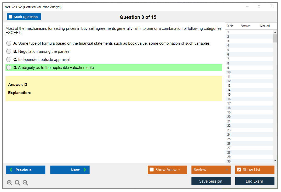 Successfully passed my NACVA CVA Exam, thanks to DumpsBoss! Their study materials are top-notch and played a crucial role in my success.