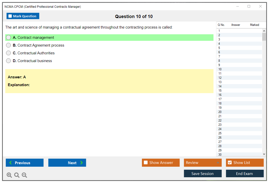 The NCMA Certified Professional Contracts Manager (CPCM) exam is a certification exam designed to validate a candidate's knowledge and skills in contract management. It is offered by the National Contract Management Association (NCMA) and is intended for professionals who manage contracts in various fields, including government and commercial sectors.