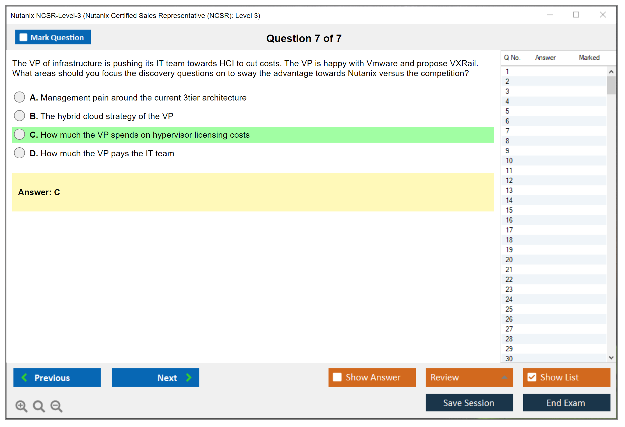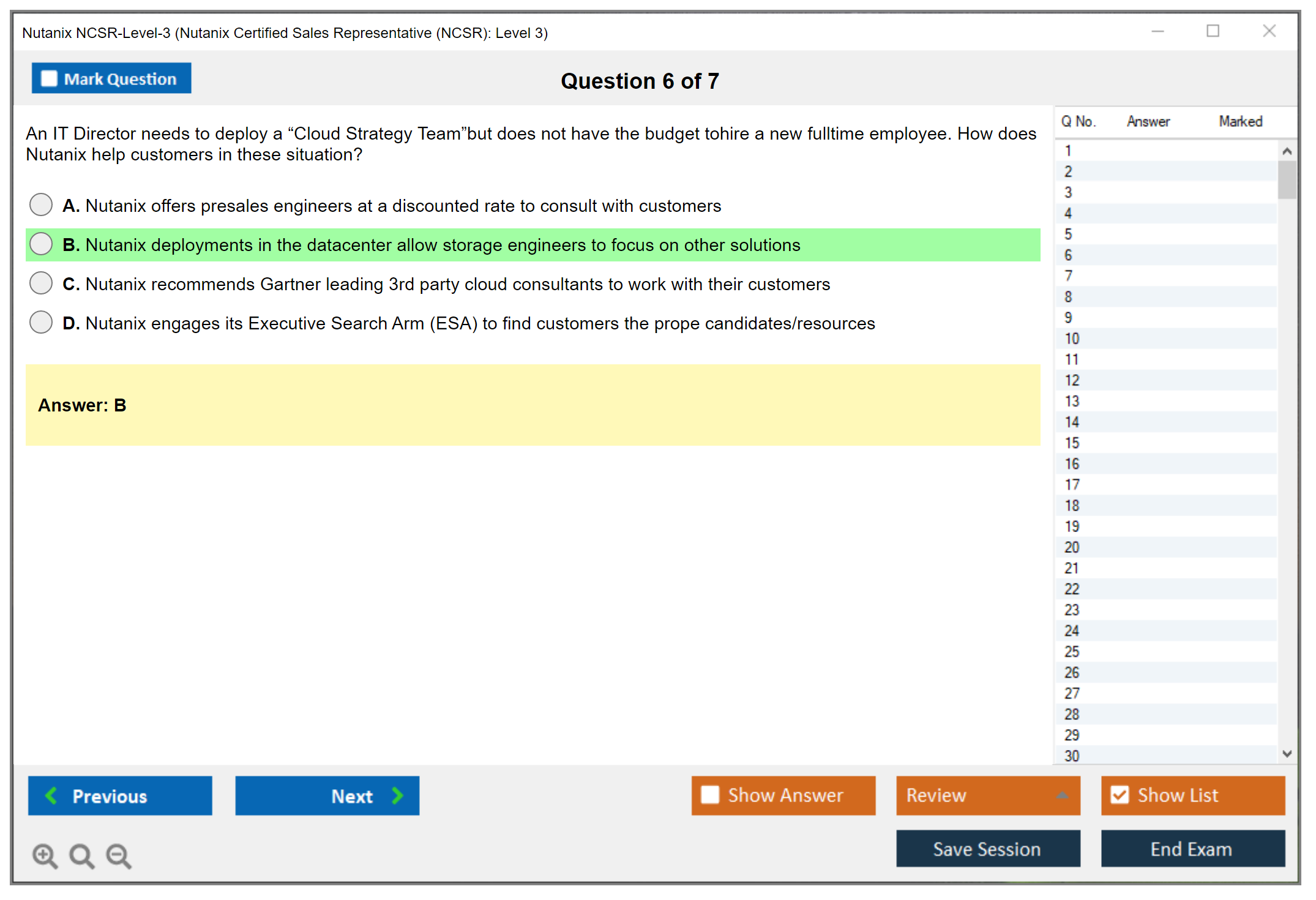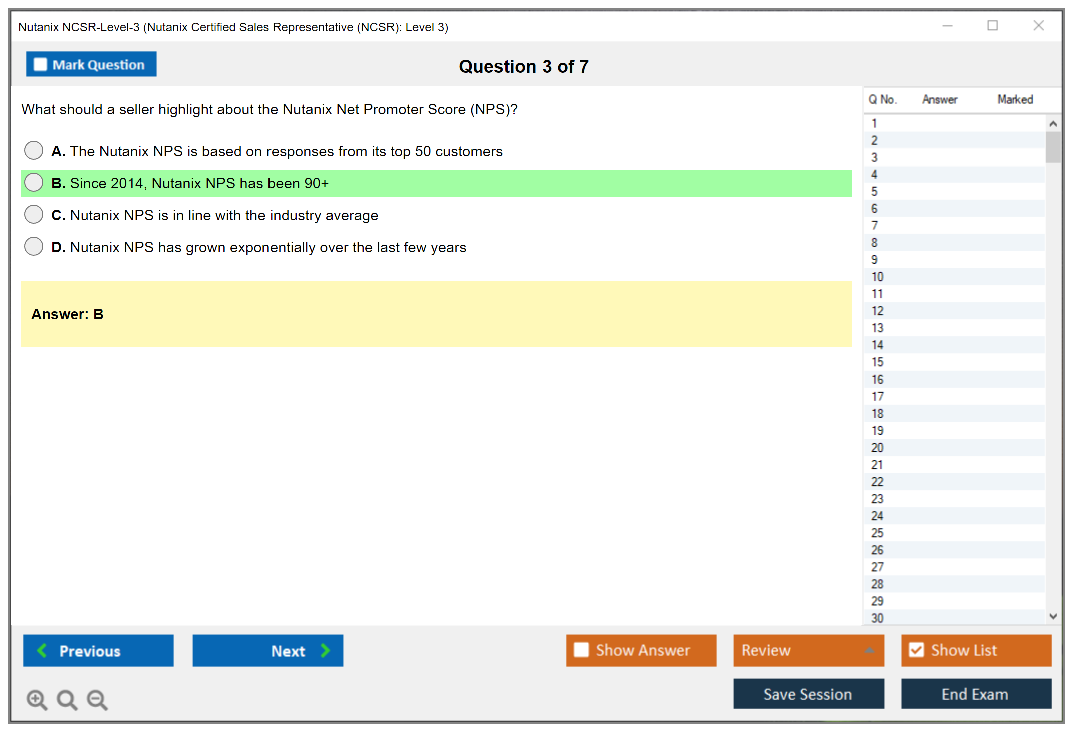 The Nutanix NCSR-Level-3 (Nutanix Certified Sales Representative: Level 3) exam is designed for sales professionals who have advanced knowledge and skills in selling Nutanix solutions. It validates their ability to understand customer needs, articulate the value proposition of Nutanix products, and effectively position them against competitors.