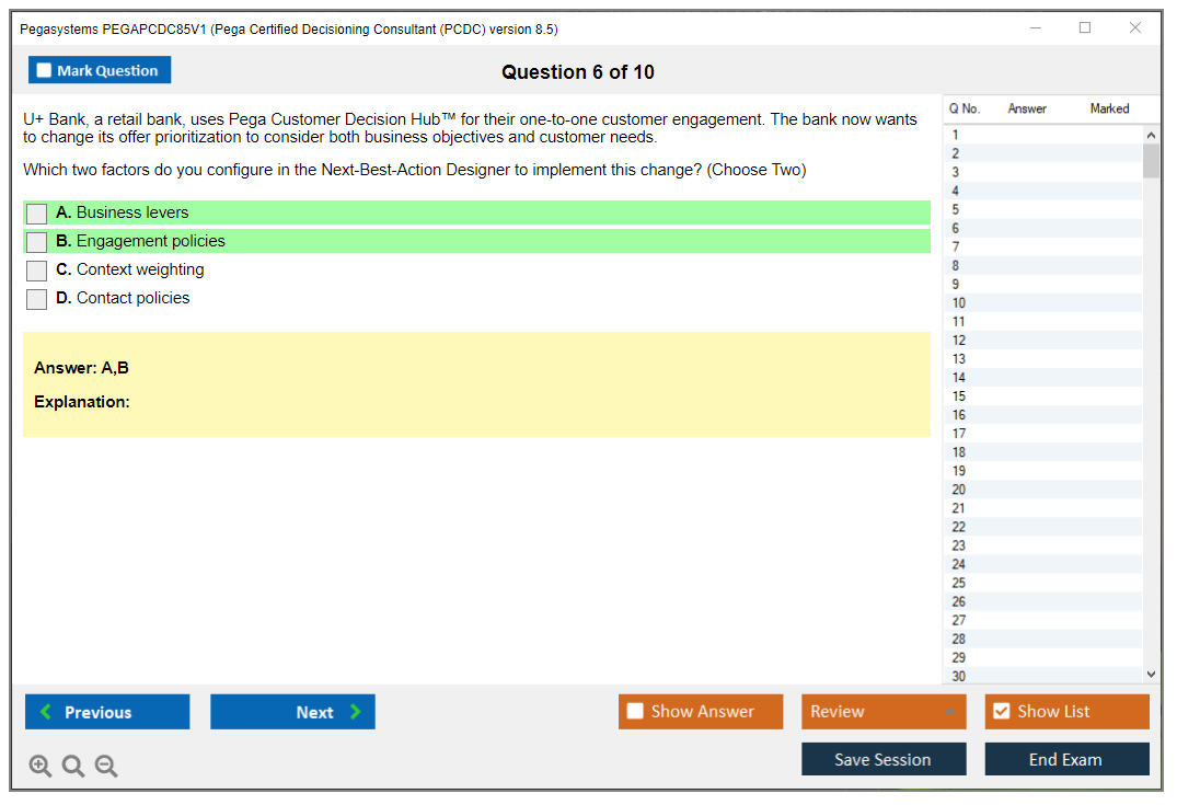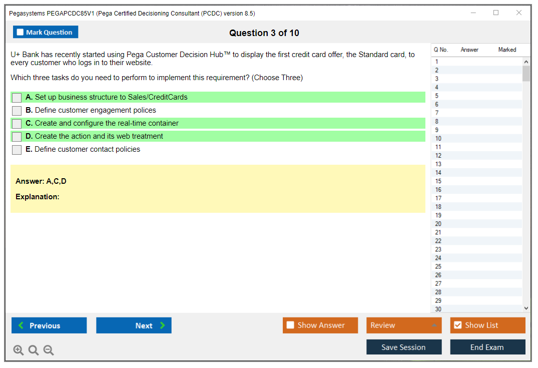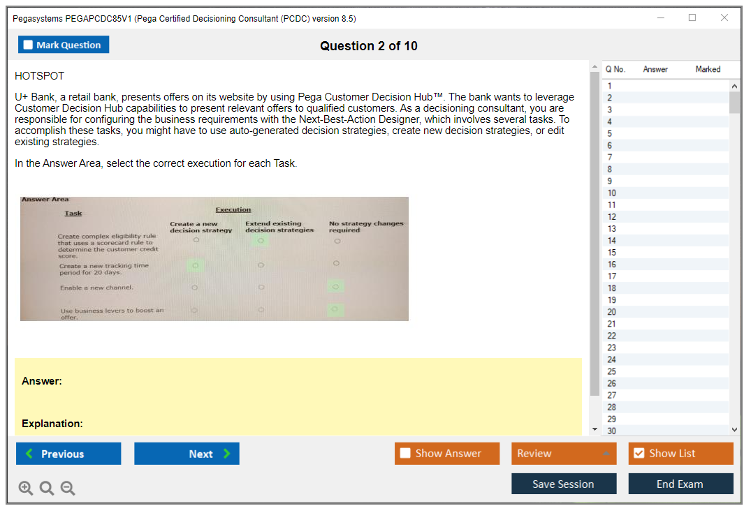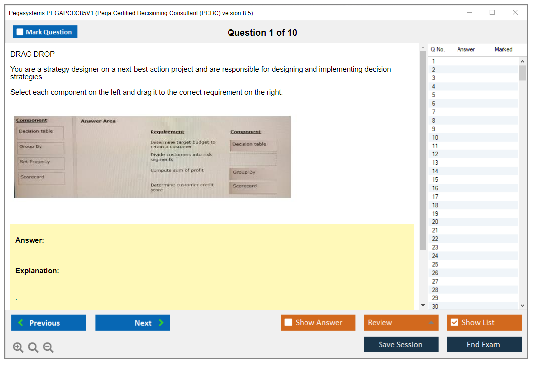 The Pegasystems PEGAPCDC85V1 (Pega Certified Decisioning Consultant (PCDC) version 8.5) Exam is designed to validate the skills and knowledge of individuals in using Pega Decision Management and Next-Best-Action capabilities. This certification demonstrates an individual's ability to design, build, and implement decisioning solutions using Pega's platform.