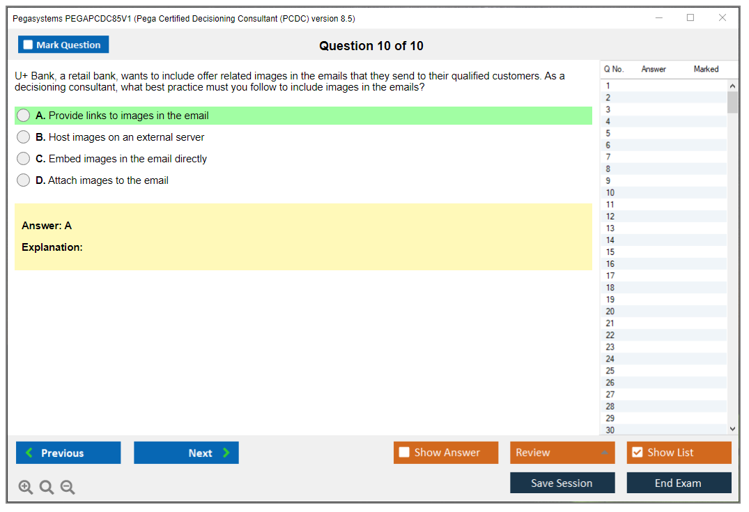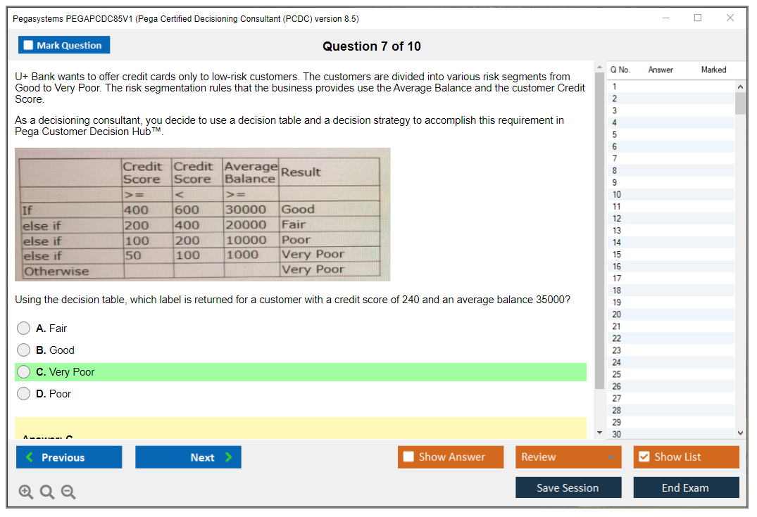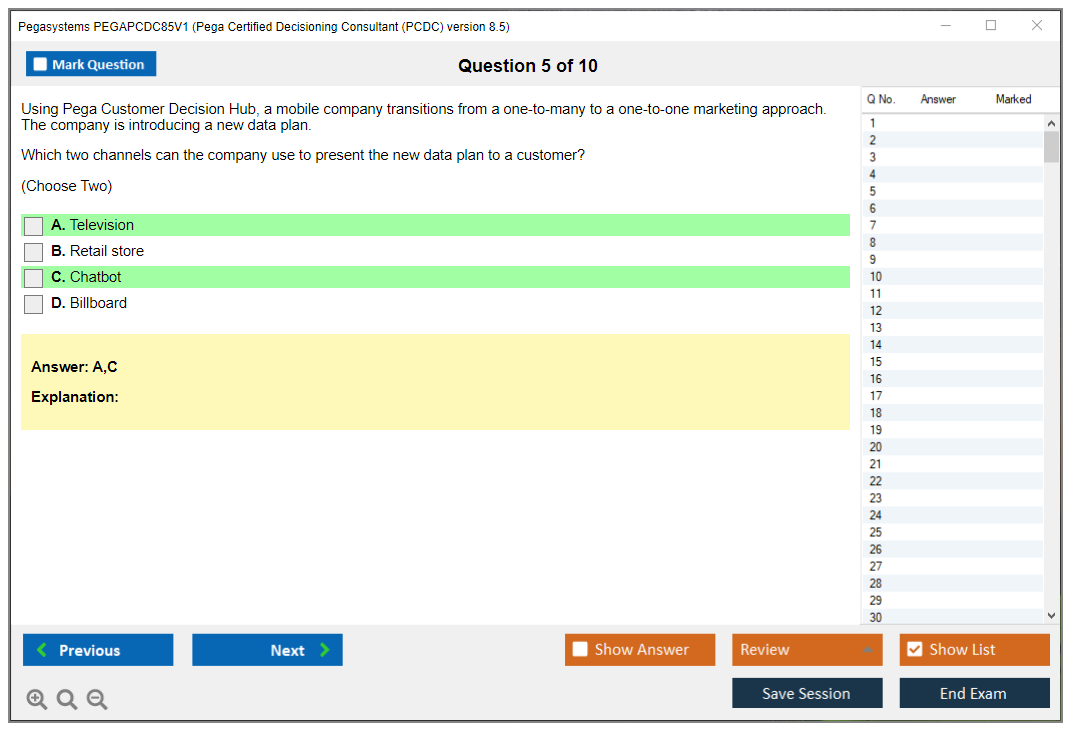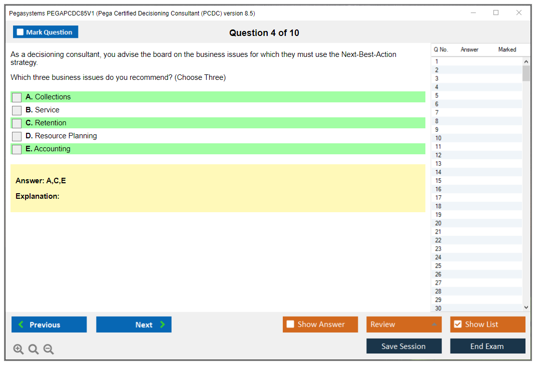 The Pegasystems PEGAPCDC85V1 (Pega Certified Decisioning Consultant (PCDC) version 8.5) Exam is designed to validate the skills and knowledge of individuals in using Pega Decision Management and Next-Best-Action capabilities. This certification demonstrates an individual's ability to design, build, and implement decisioning solutions using Pega's platform.