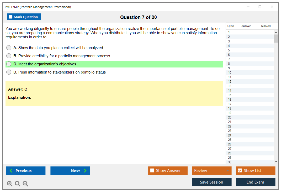 The PMI Portfolio Management Professional (PfMP) exam is a globally recognized certification that validates an individual's advanced competency in the coordinated management of one or more portfolios to achieve organizational objectives. The certification is designed for experienced portfolio managers who are responsible for the success of one or more portfolios within an organization.