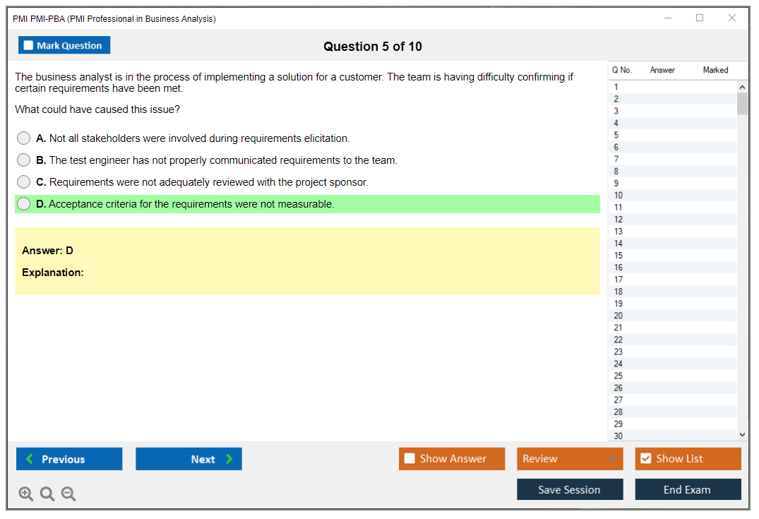Sample questions for the PMI-PBA exam can be found in the PMI-PBA Handbook and other study materials provided by PMI and third-party exam prep providers.
