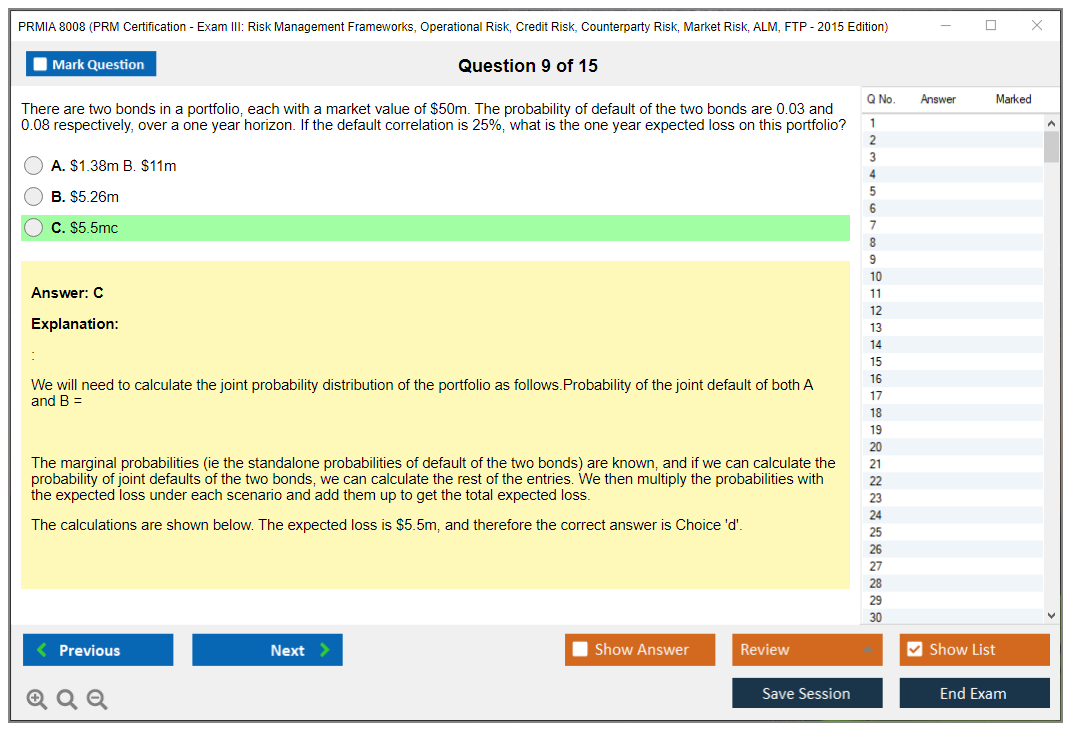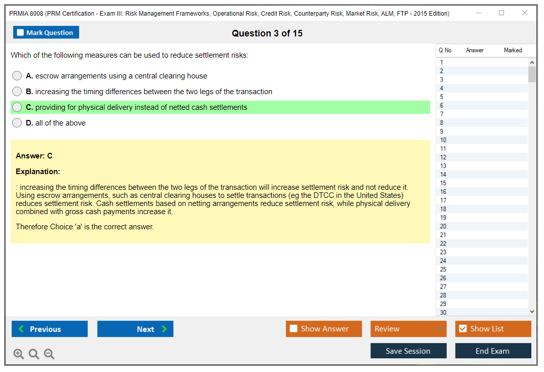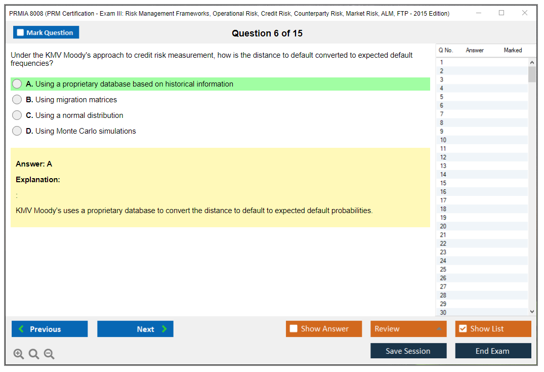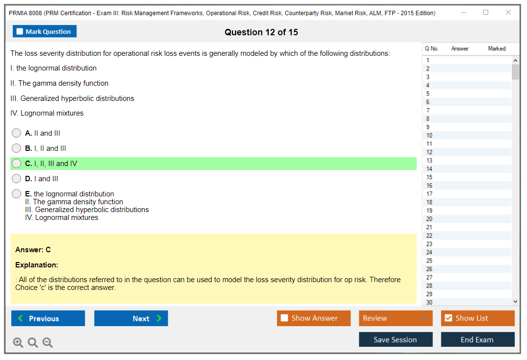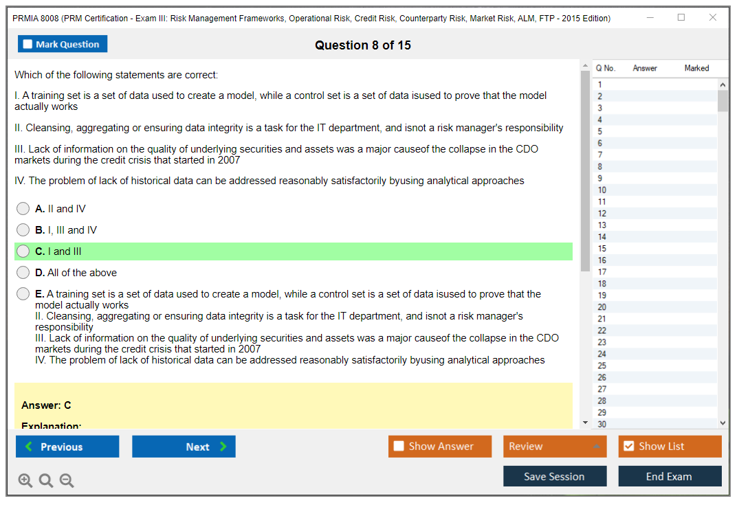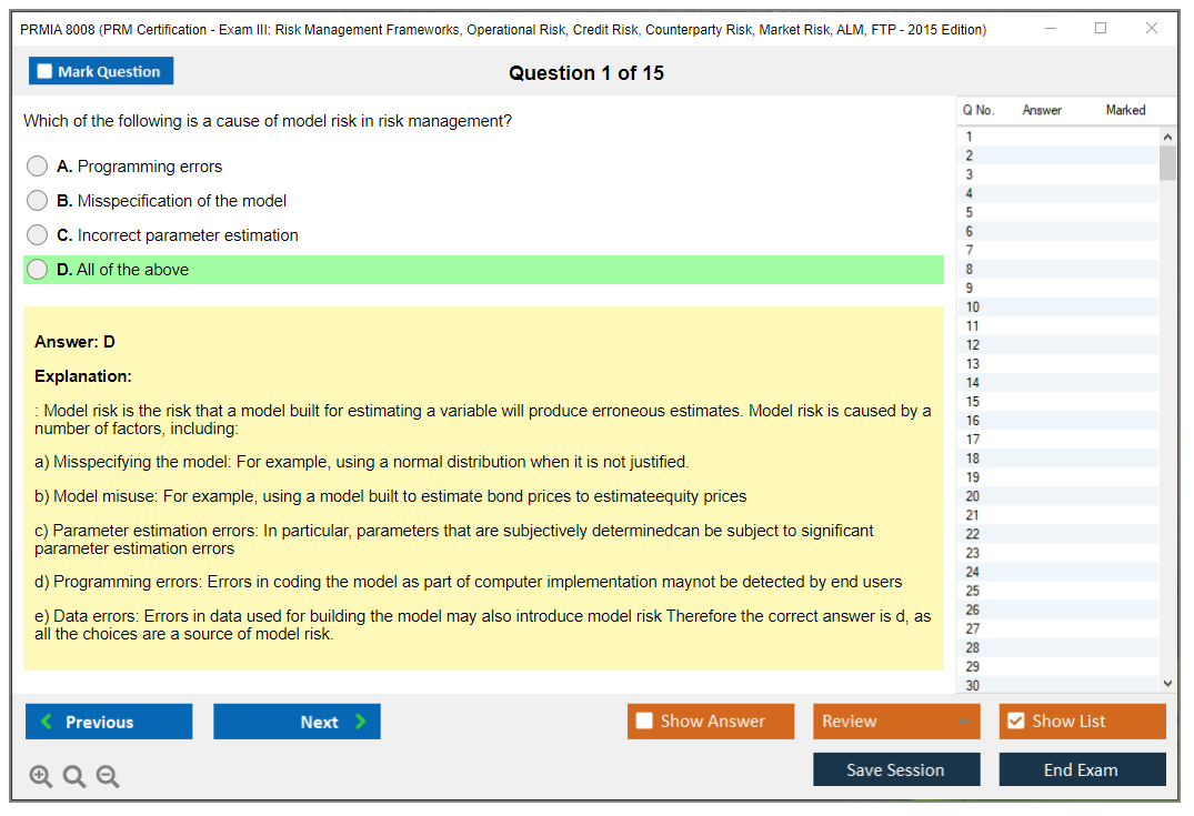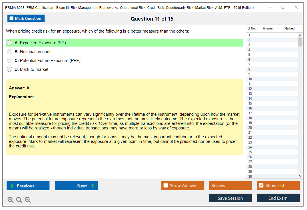 The PRMIA 8008 (PRM Certification - Exam III: Risk Management Frameworks, Operational Risk, Credit Risk, Counterparty Risk, Market Risk, ALM, FTP - 2015 Edition) is a certification exam designed to test the knowledge and skills of professionals in various risk management domains. It covers a wide range of topics including risk management frameworks, operational risk, credit risk, counterparty risk, market risk, asset-liability management (ALM), and funds transfer pricing (FTP).
