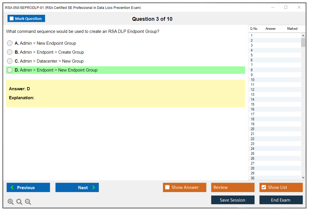The RSA 050-SEPRODLP-01 exam is administered by authorized RSA testing providers such as Pearson VUE.