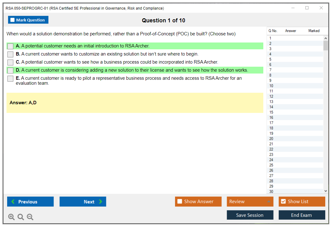There are no formal prerequisites for the RSA 050-SEPROGRC-01 Exam, but having relevant experience and training is highly recommended.