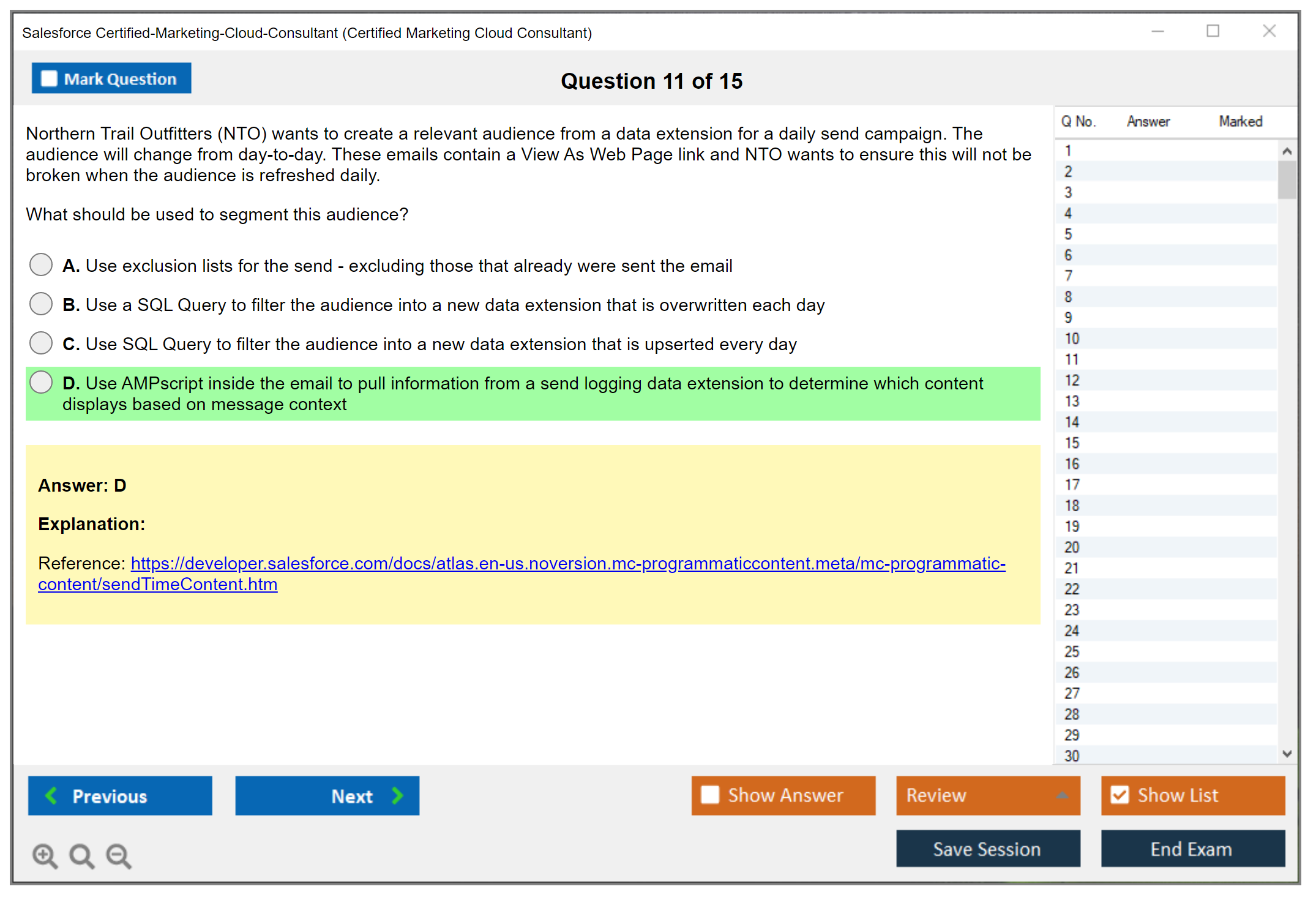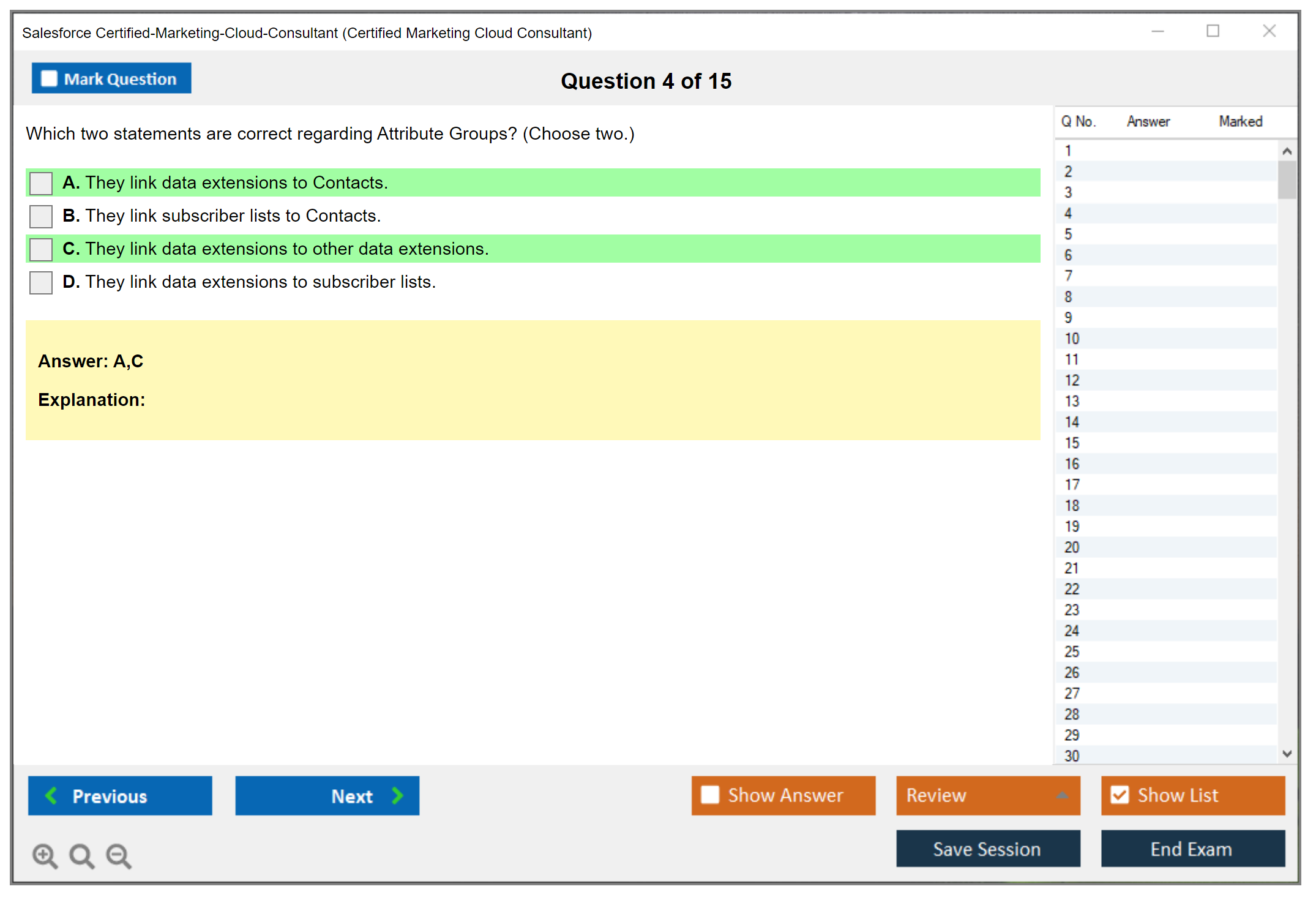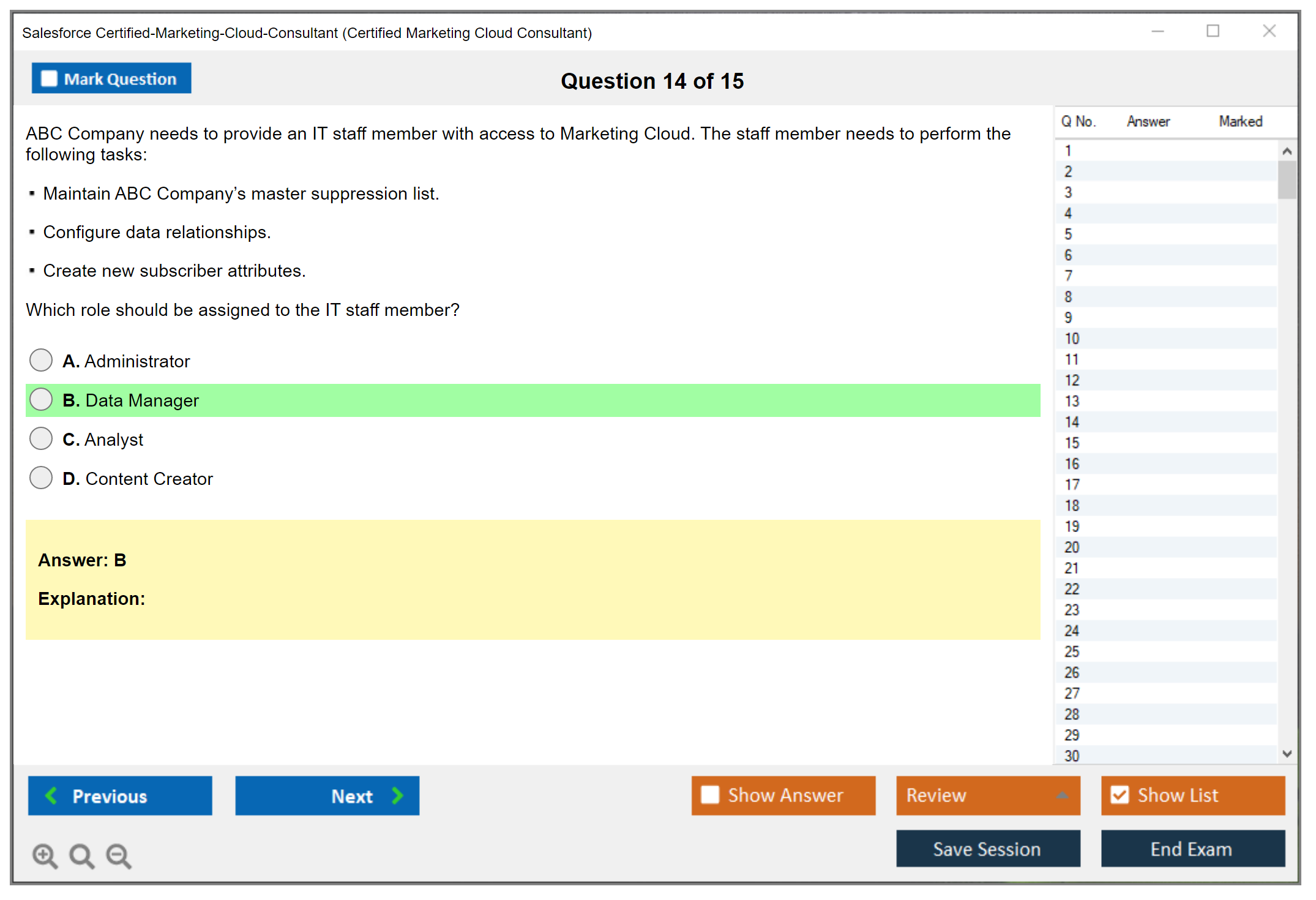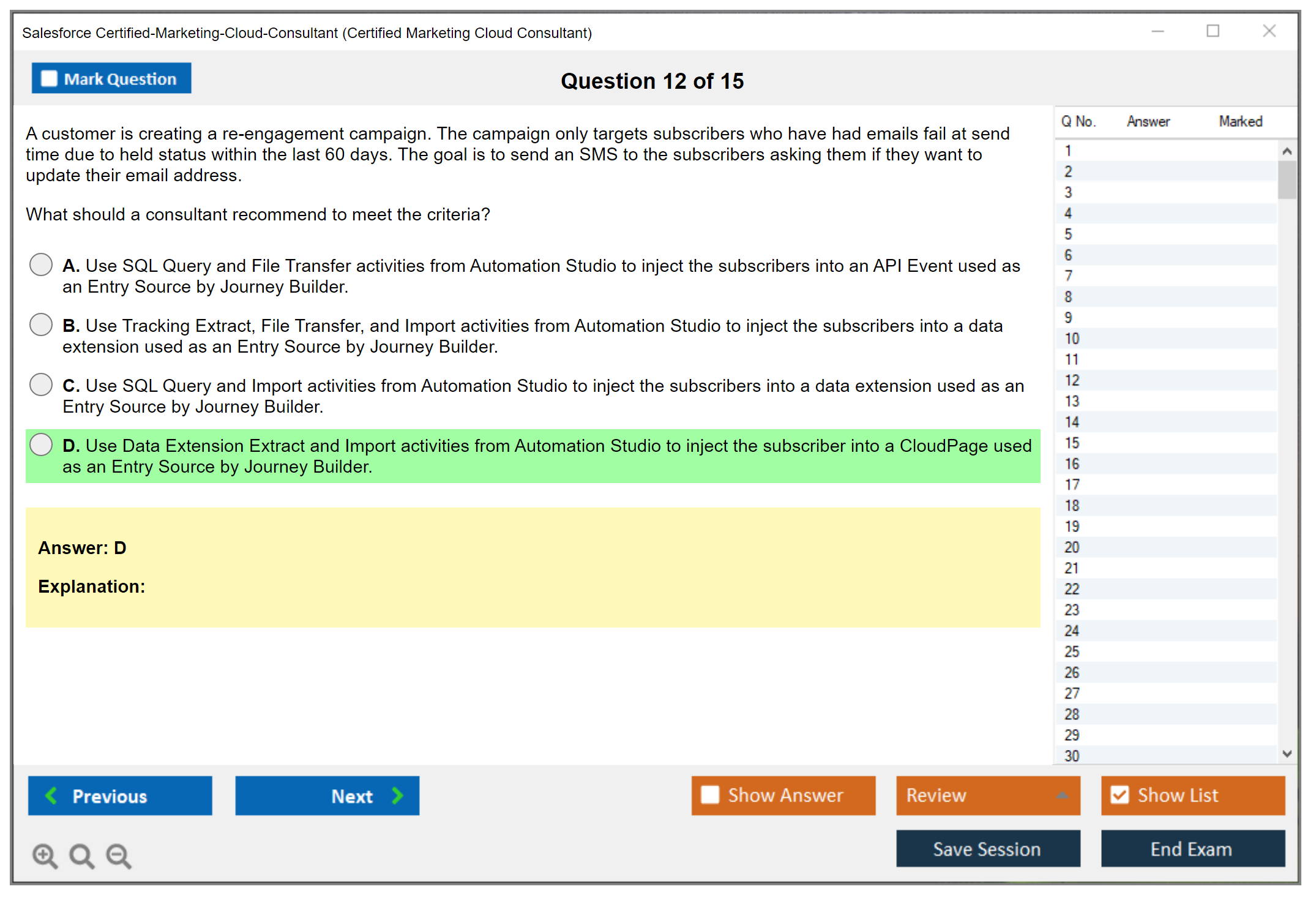 DumpsBoss’s Certified Marketing Cloud Consultant practice test is fantastic! The well-crafted questions reflect the actual exam perfectly, making my prep efficient and targeted. A top choice for exam success!