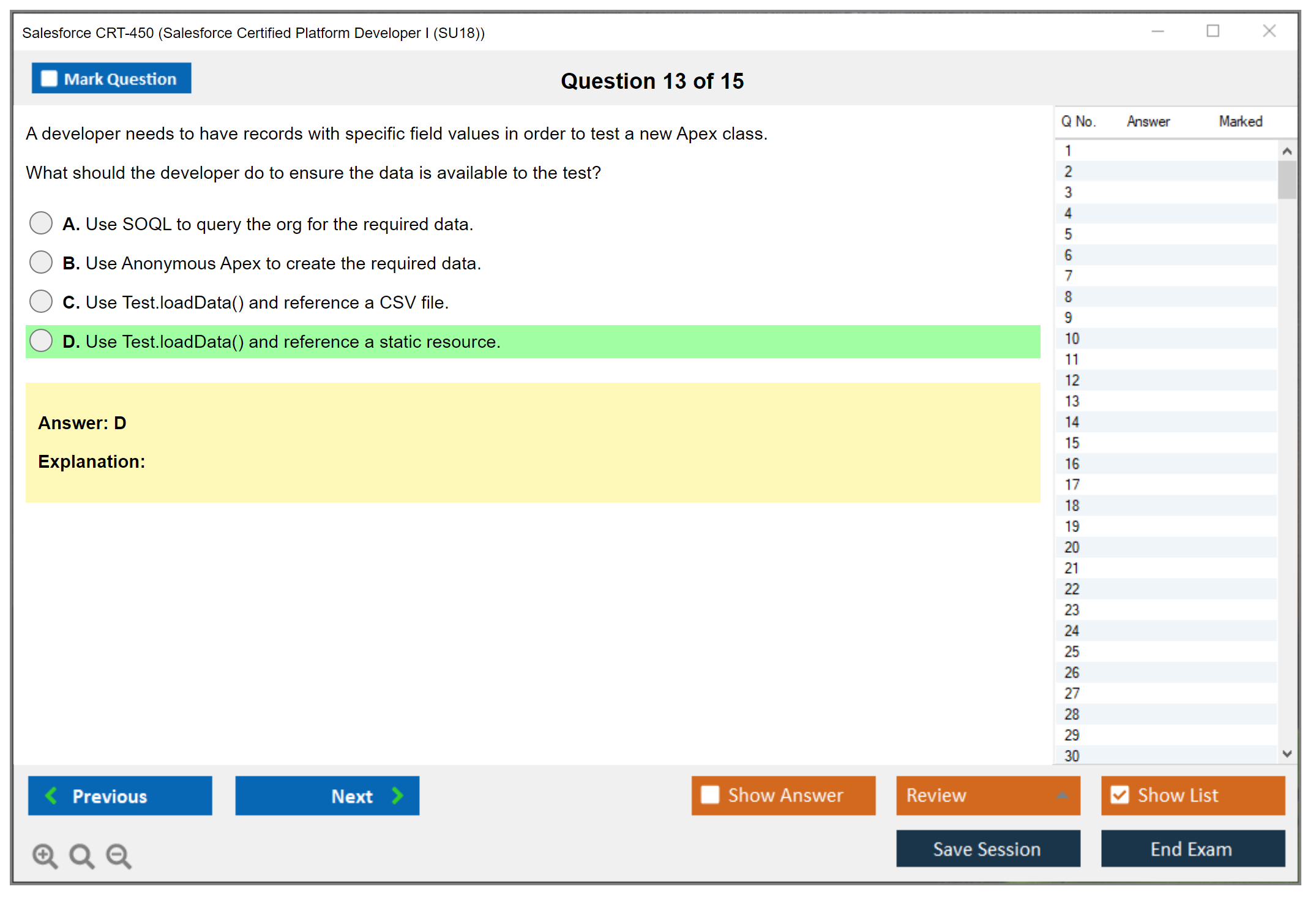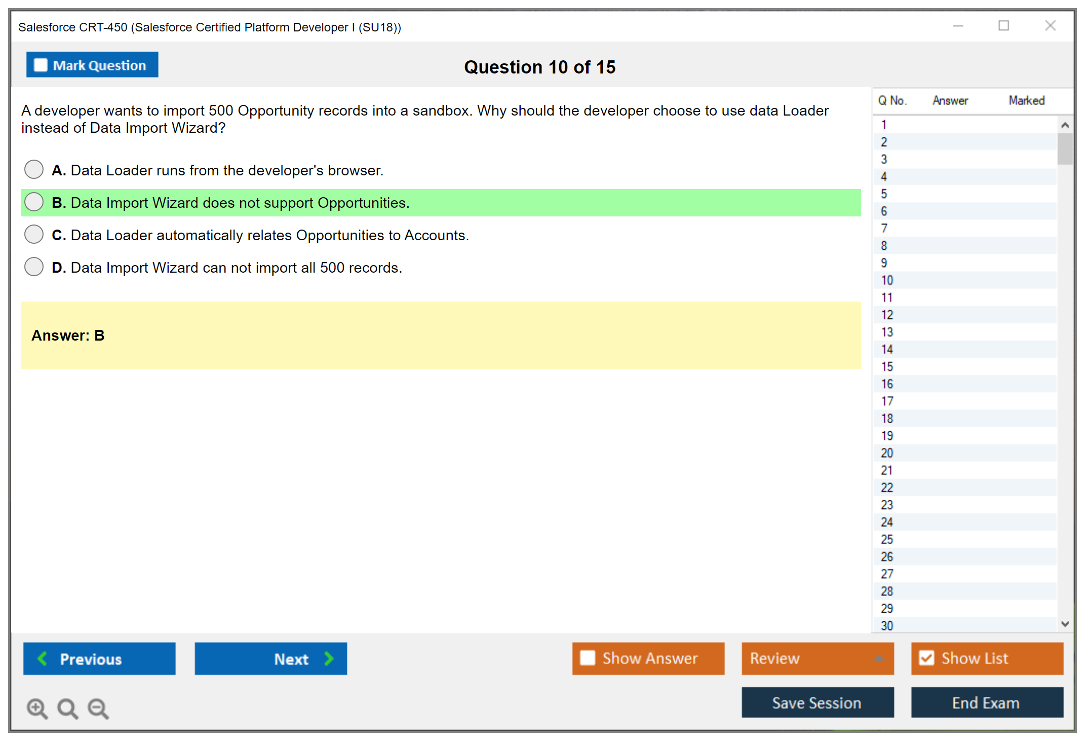 DumpsBoss is a game-changer for CRT-450 exam prep! Their website provides an extensive set of CRT-450 questions with clear explanations, ensuring I understand every concept. Thanks to DumpsBoss, I'm confident in my ability to excel in the Salesforce Developer certification!