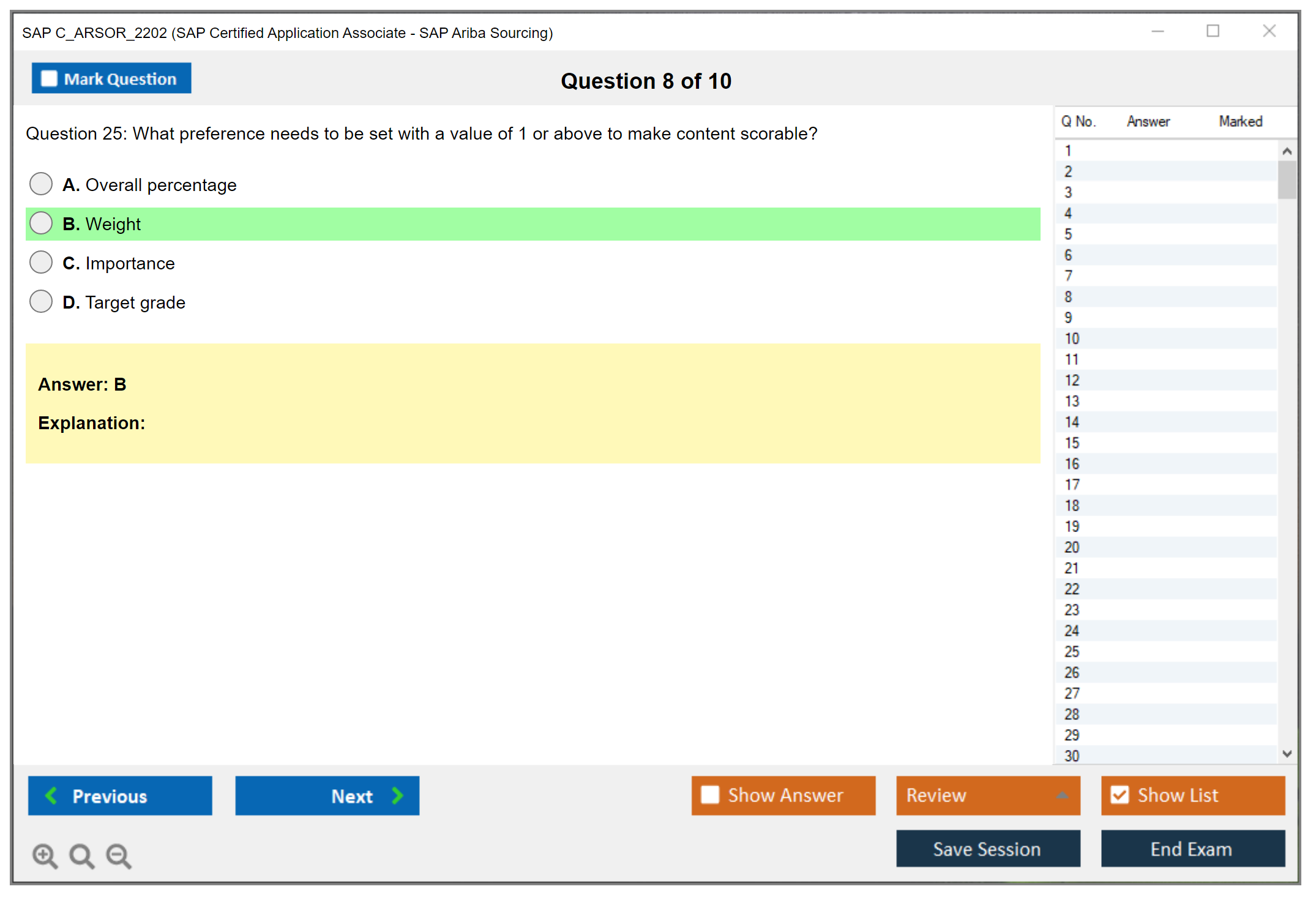 The SAP C_ARSOR_2202 exam is designed to verify the candidate's knowledge and skills in SAP Ariba Sourcing. It covers various aspects of the application, including configuration, integration, and implementation. The exam ensures that the candidate is proficient in using SAP Ariba Sourcing to meet business requirements.