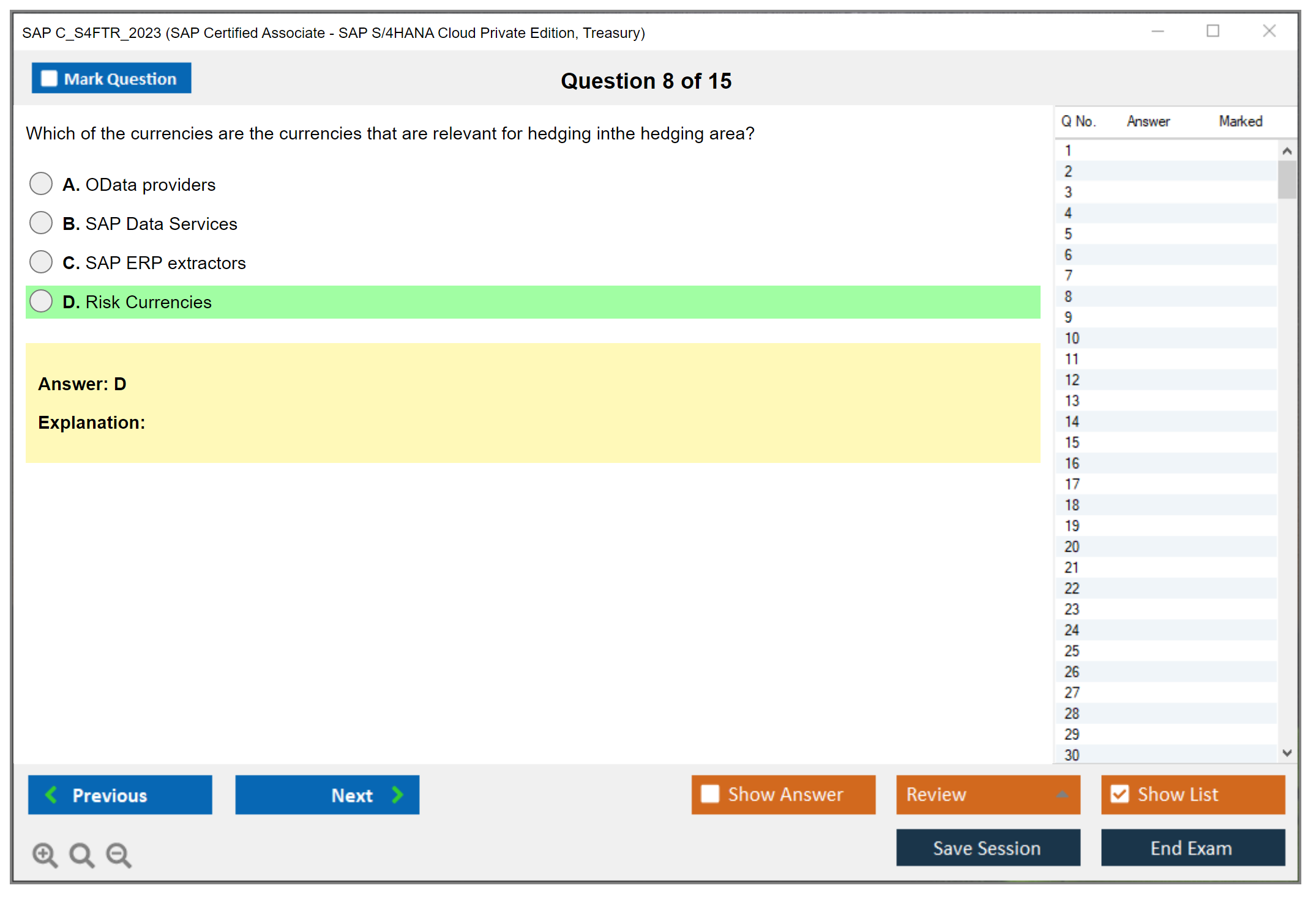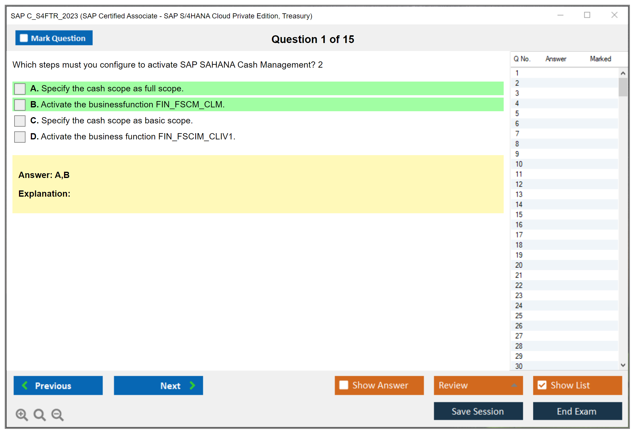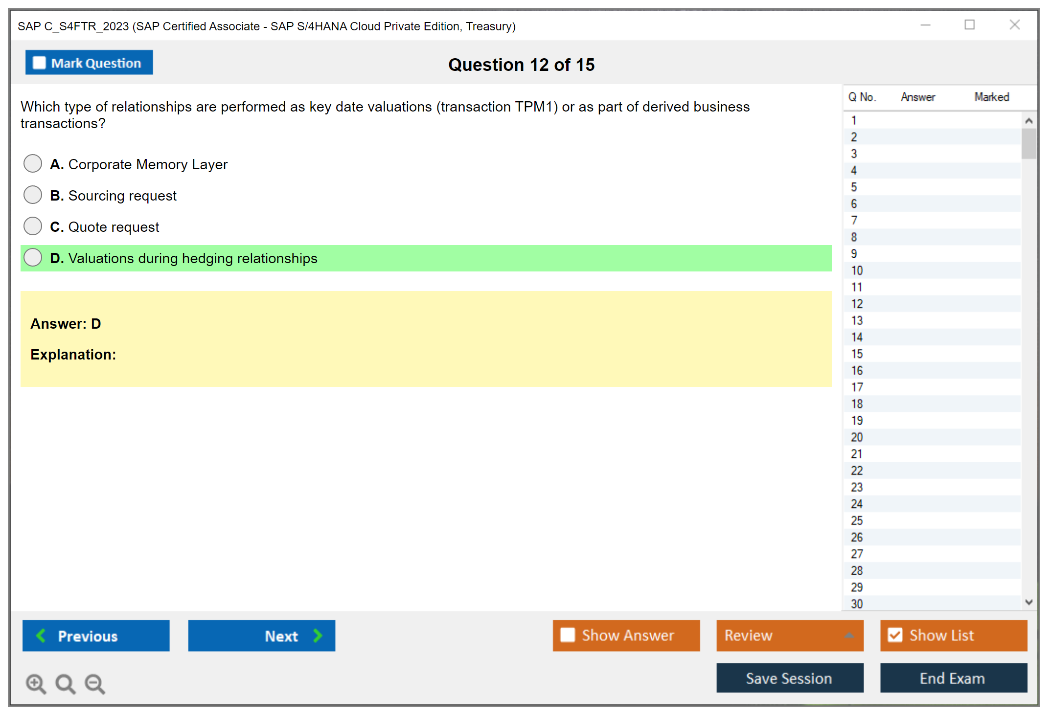 The SAP C_S4FTR_2023 exam is a certification test for the SAP S/4HANA Cloud Private Edition, Treasury module. It assesses the candidate's ability to apply their knowledge in practical scenarios and ensures they are proficient in using SAP's treasury functionalities.