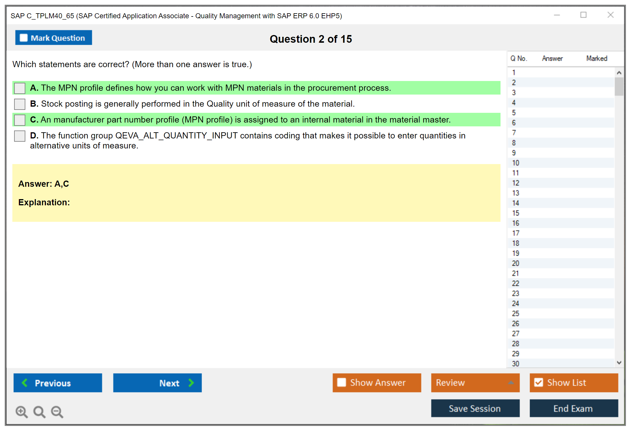 The SAP C_TPLM40_65 exam, also known as SAP Certified Associate - Quality Management with SAP ERP 6.0 EHP5, is a certification that assesses a candidate's knowledge and abilities in implementing and managing quality management processes in SAP ERP.