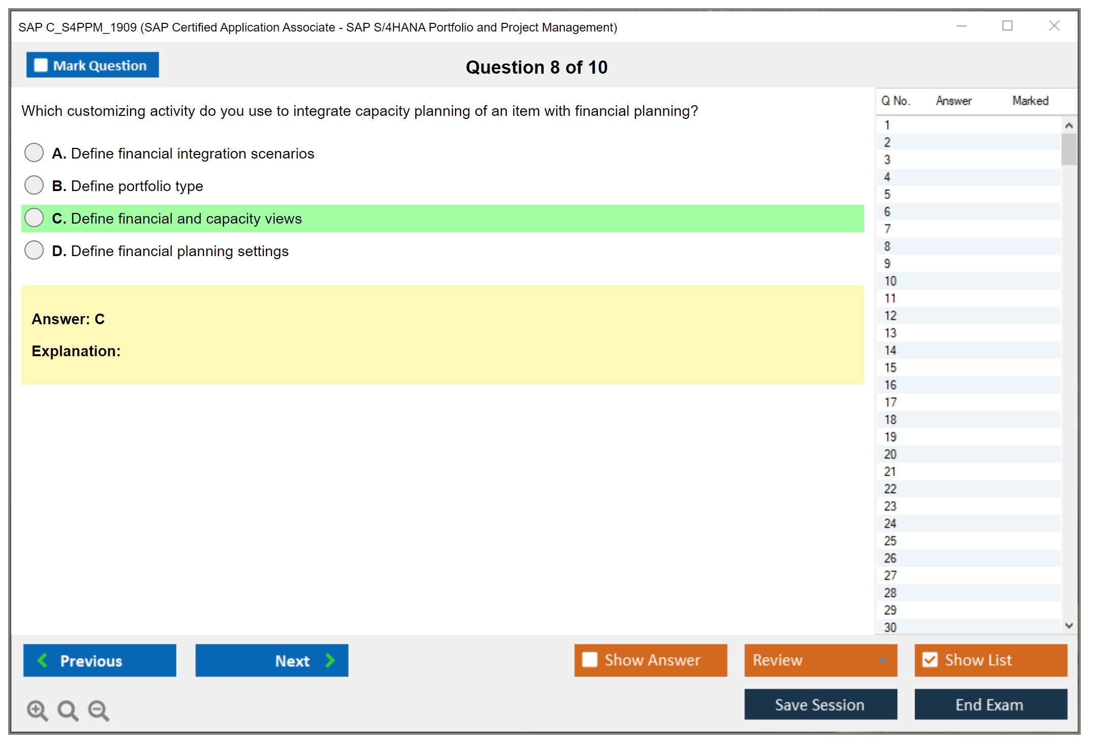 The SAP C_S4PPM_1909 Exam assesses the candidate's knowledge in the implementation and configuration of SAP S/4HANA Portfolio and Project Management. It covers various aspects such as project management, portfolio management, and integration with other SAP modules.