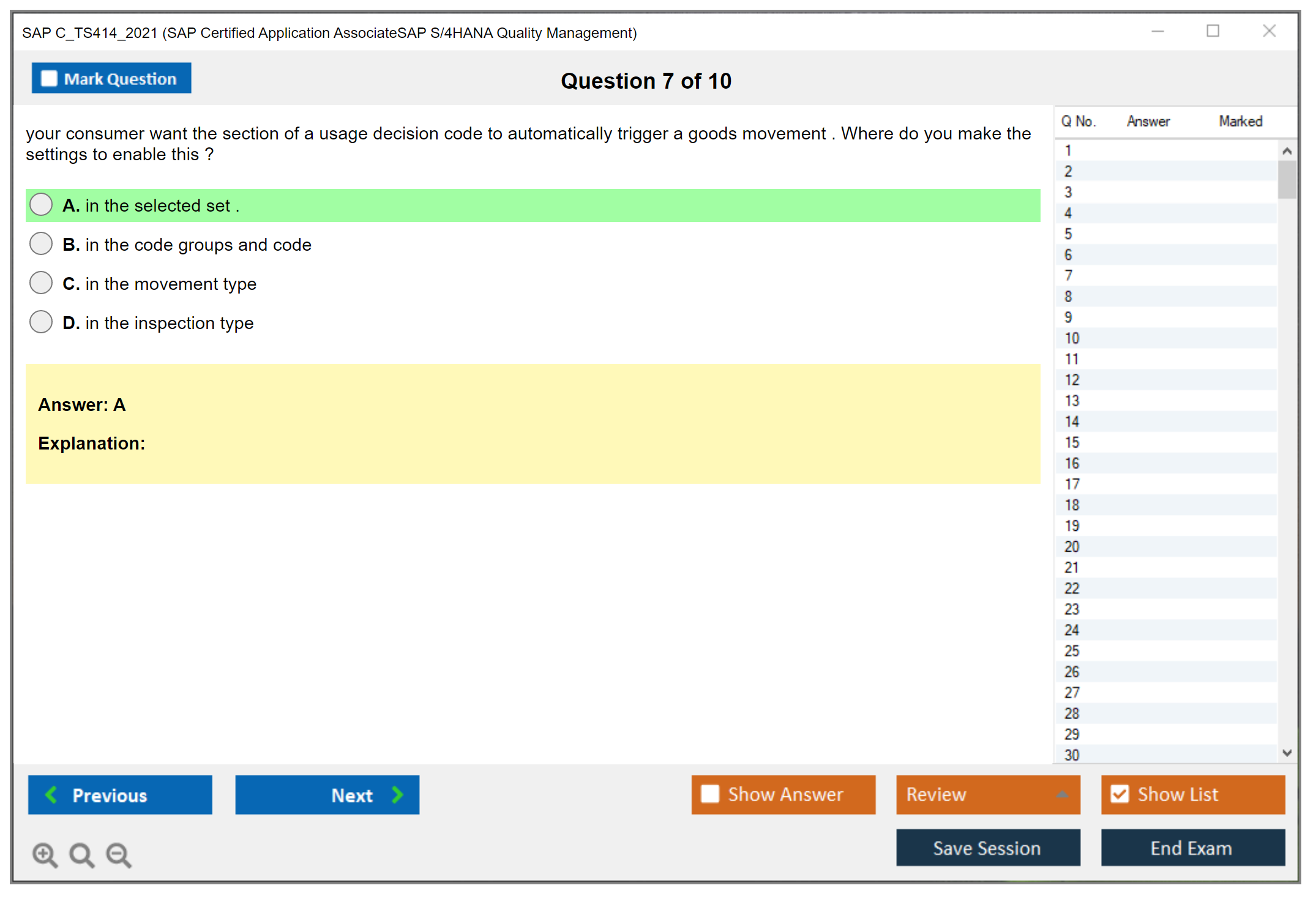 The SAP C_TS414_2021 exam is an associate-level certification that focuses on validating the candidate's knowledge and skills in SAP S/4HANA Quality Management. It tests the candidate's ability to implement and manage quality management processes within the SAP S/4HANA environment.