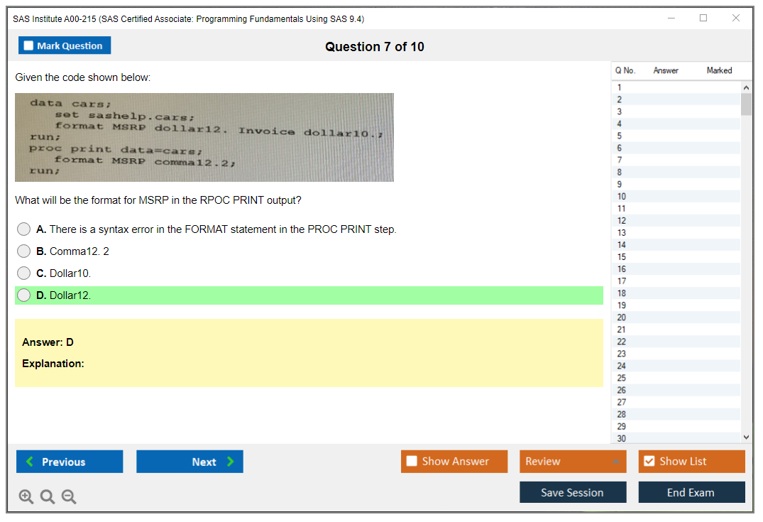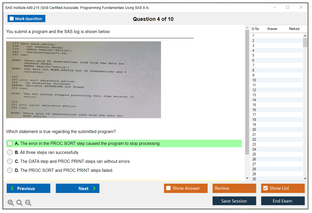 The SAS Institute A00-215 exam is part of the SAS certification track and can be followed by more advanced certifications such as the SAS Certified Specialist or SAS Certified Professional.