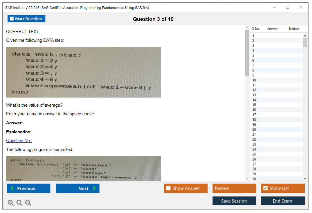The question format of the SAS Institute A00-215 exam includes multiple-choice and short-answer questions.