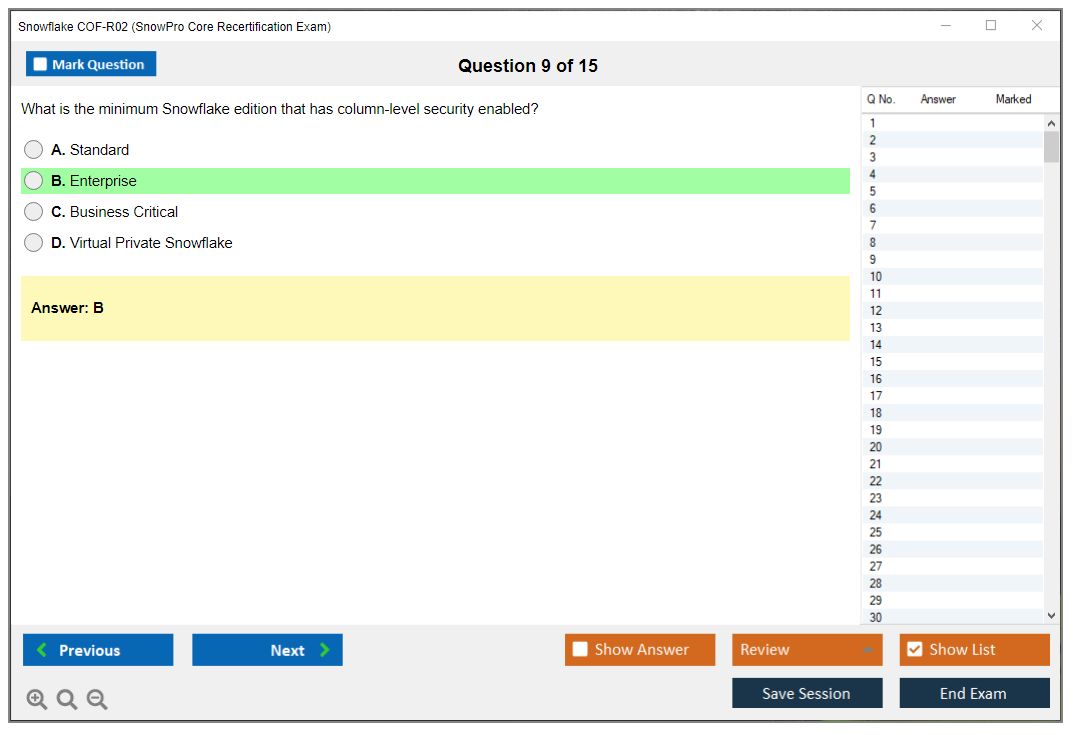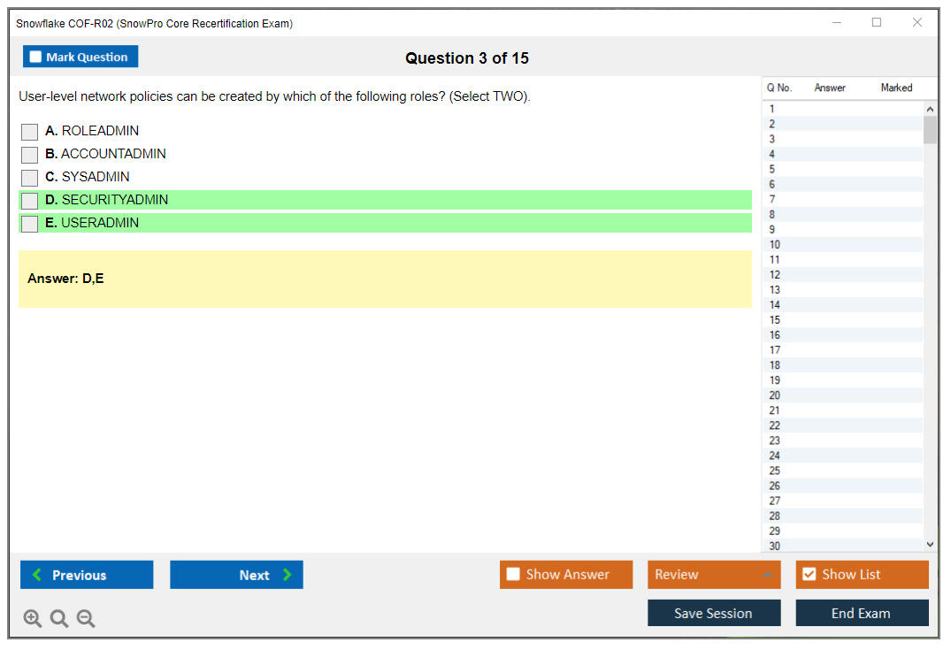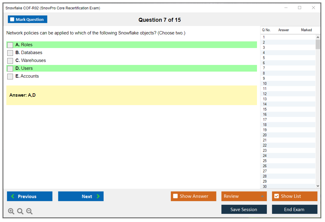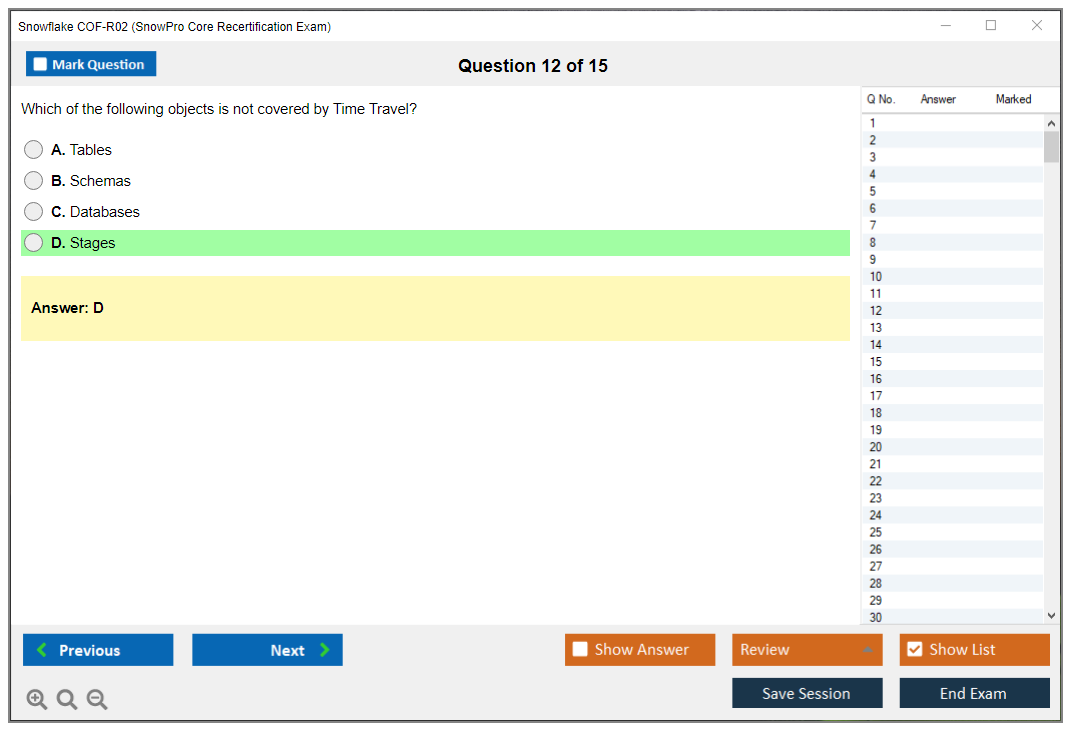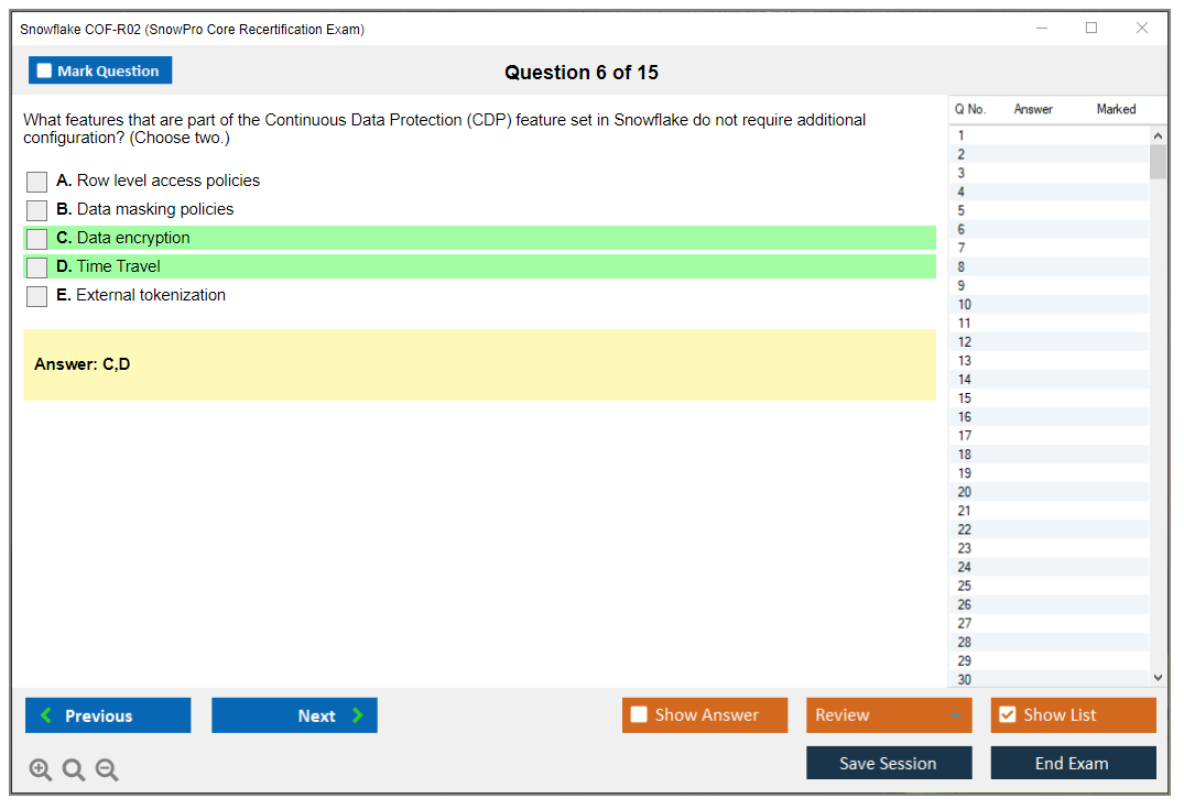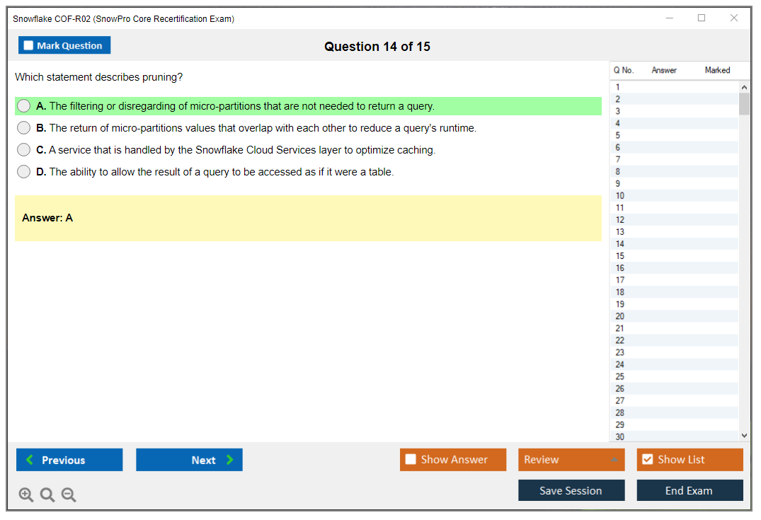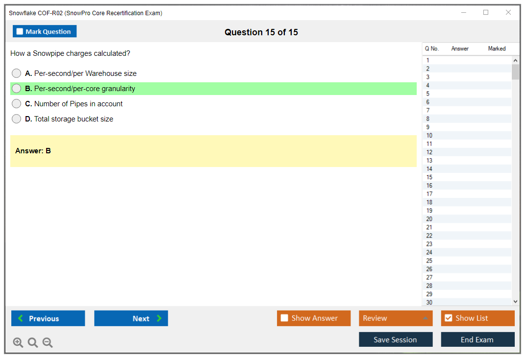 The Snowflake COF-R02 (SnowPro Core Recertification Exam) is designed for individuals who have previously passed the SnowPro Core Certification Exam and need to recertify their knowledge and skills in Snowflake. This exam ensures that certified professionals stay current with Snowflake's evolving features and best practices.