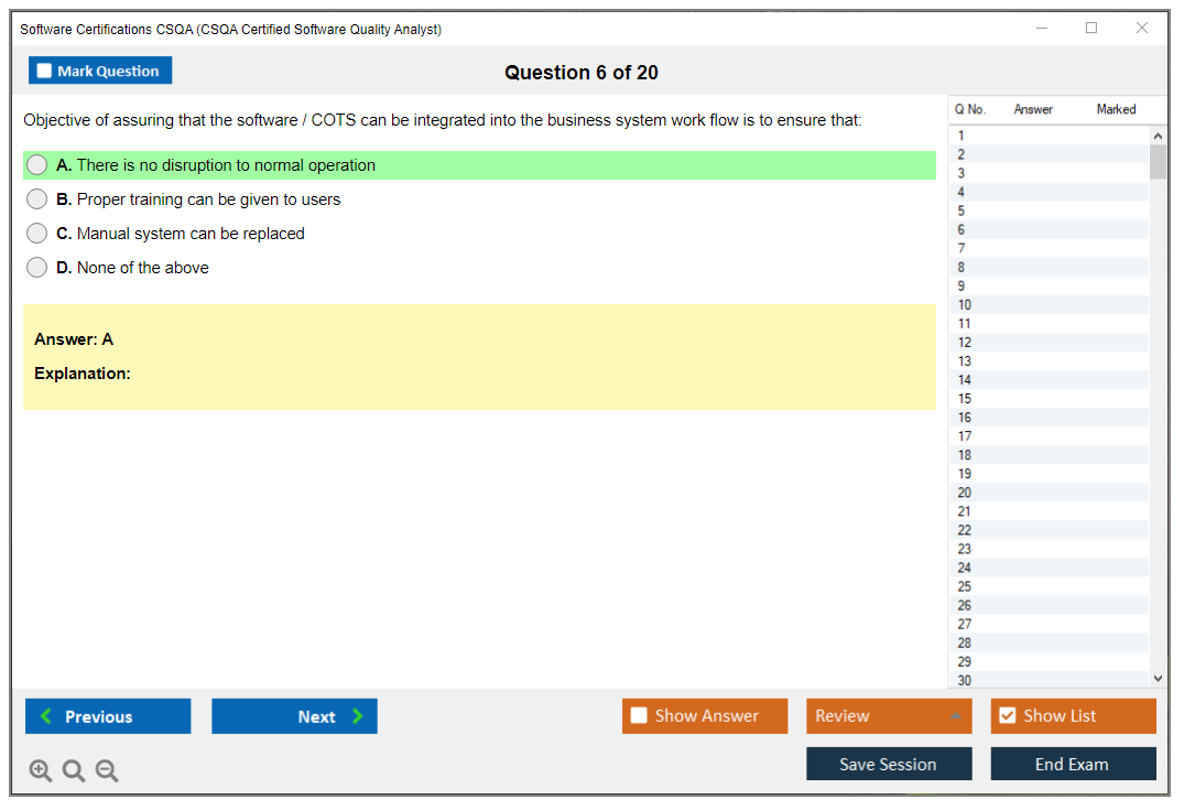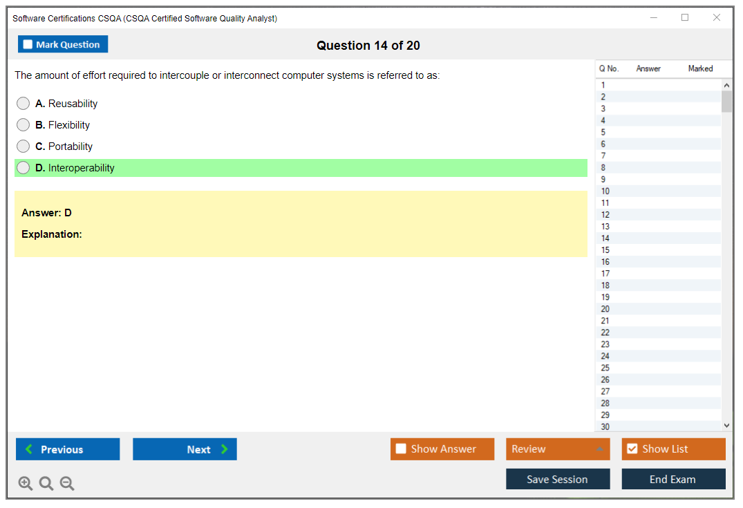 The Certified Software Quality Analyst (CSQA) exam is a certification offered by the Quality Assurance Institute (QAI) to validate the skills and knowledge of professionals in software quality assurance. The certification is designed to assess the candidate's ability to understand and apply principles and practices of software quality assurance.