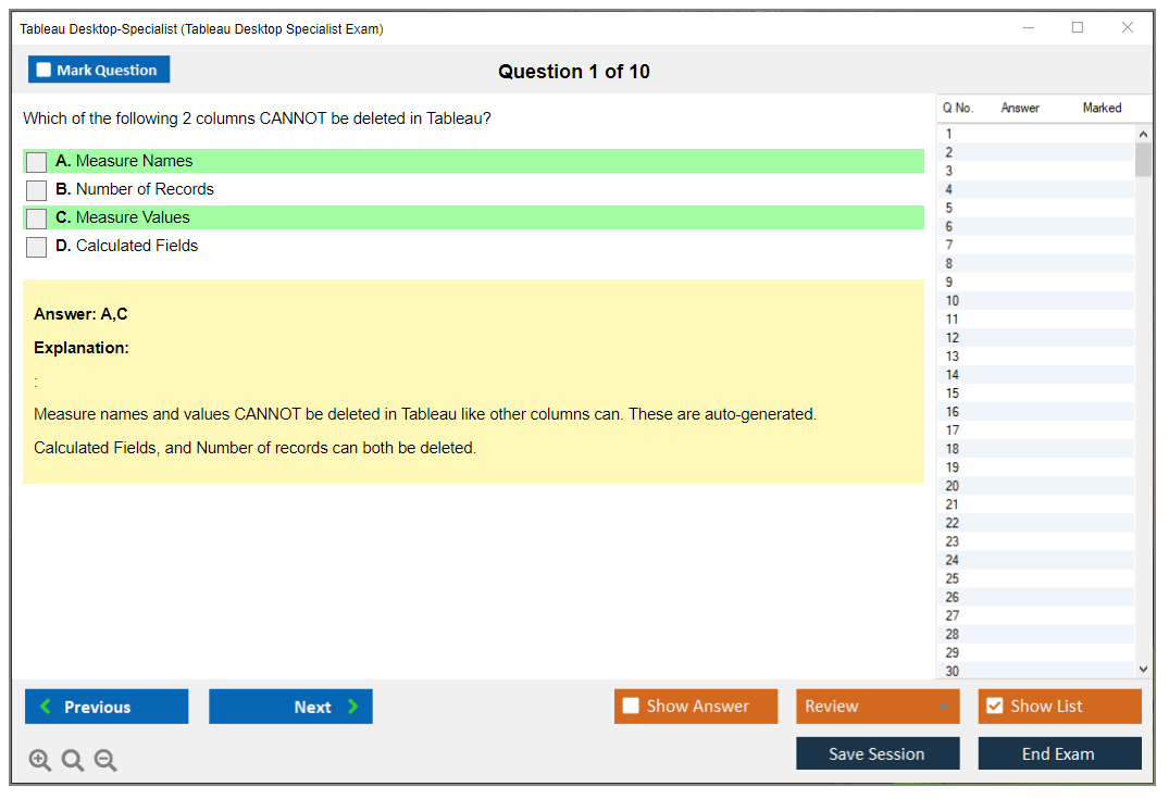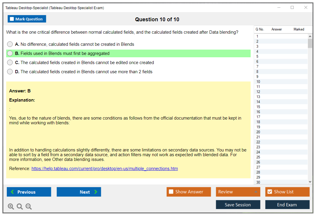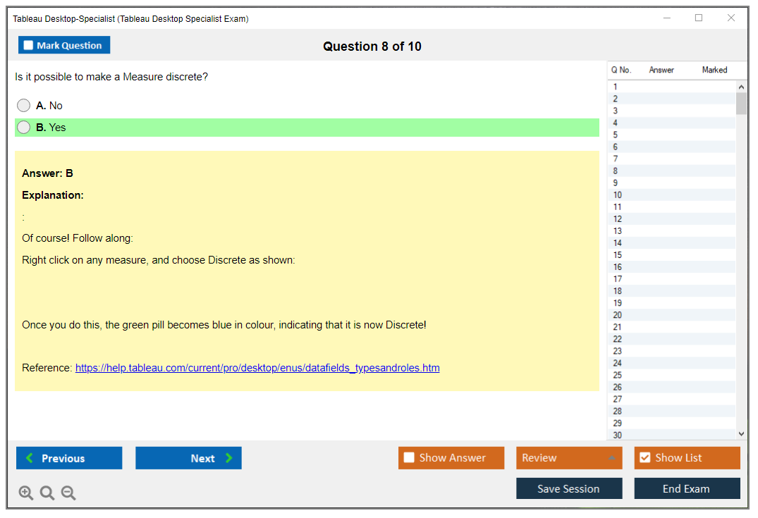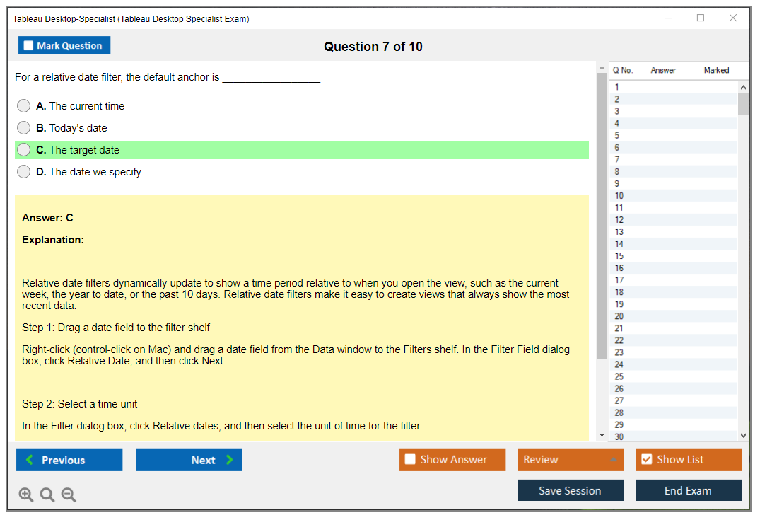 The Tableau Desktop Specialist Exam consists of 30 questions.