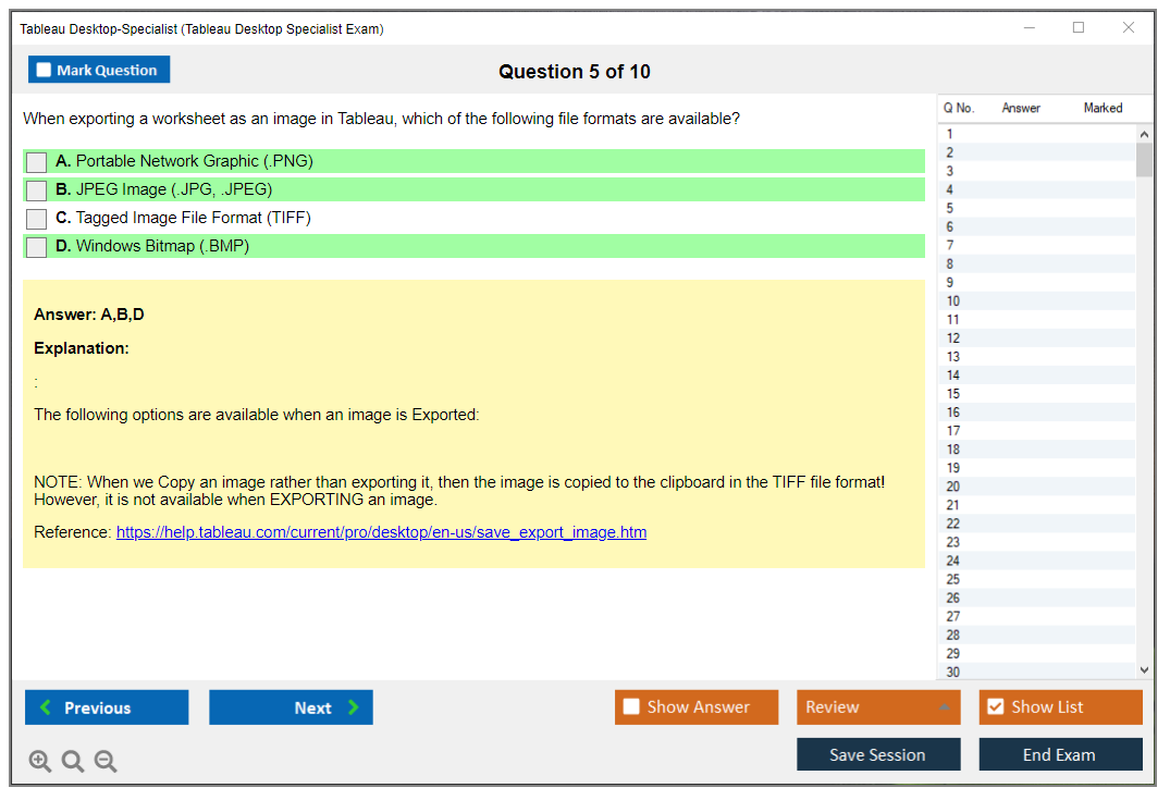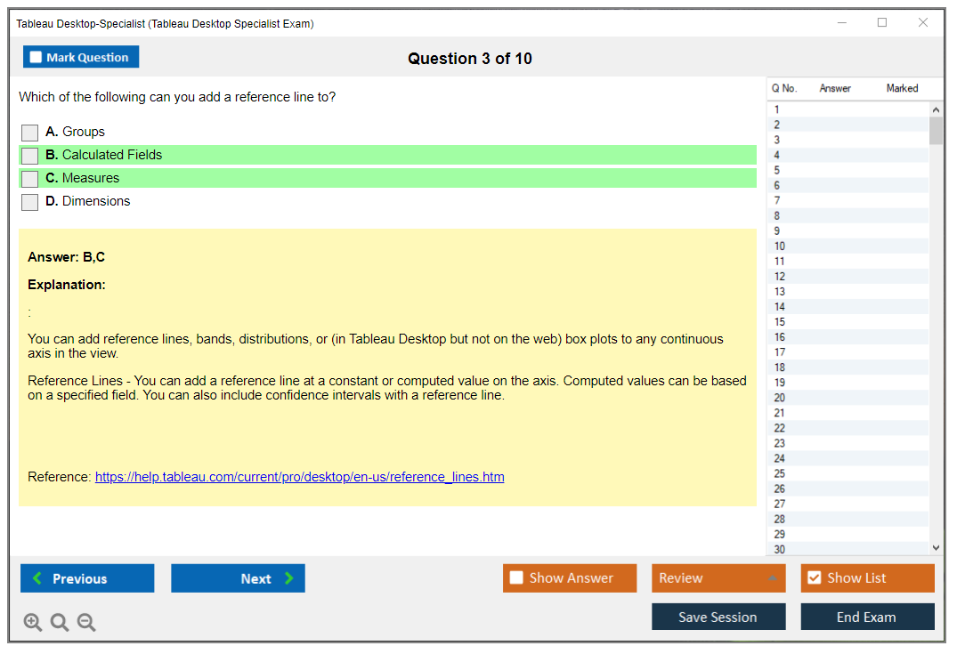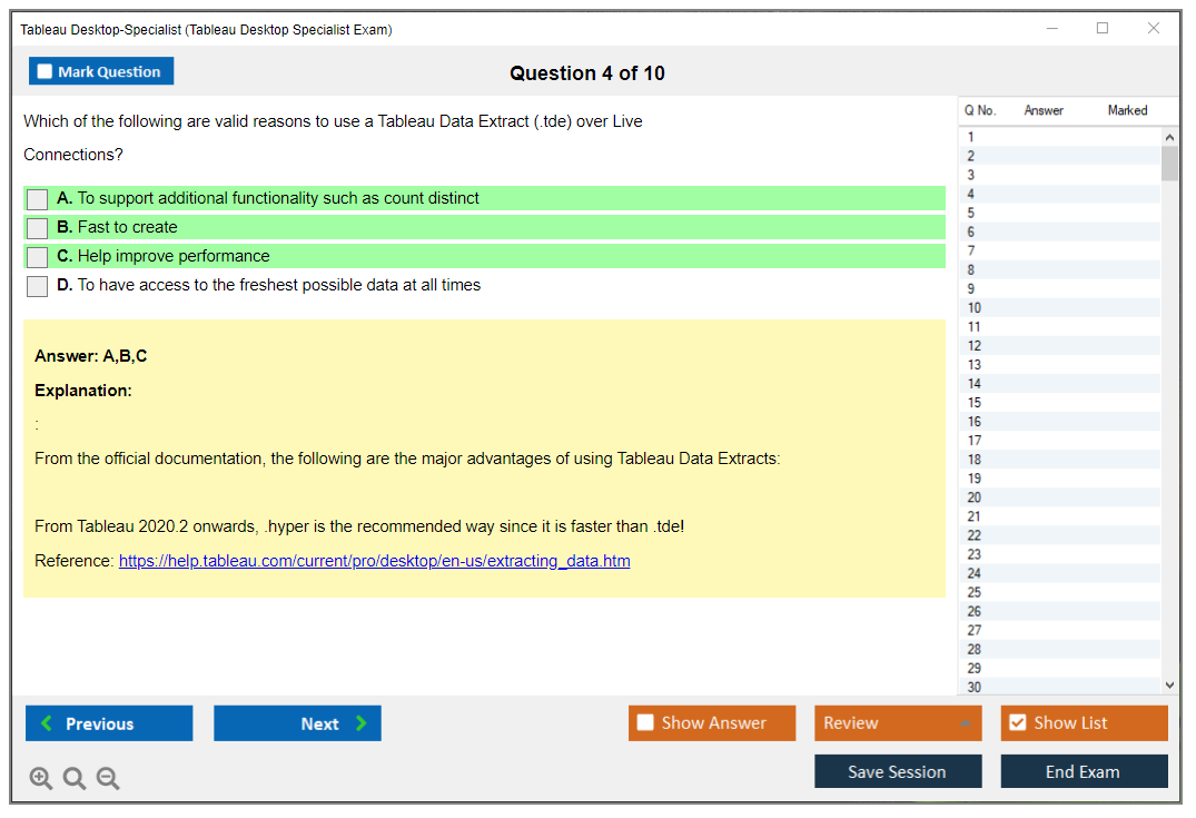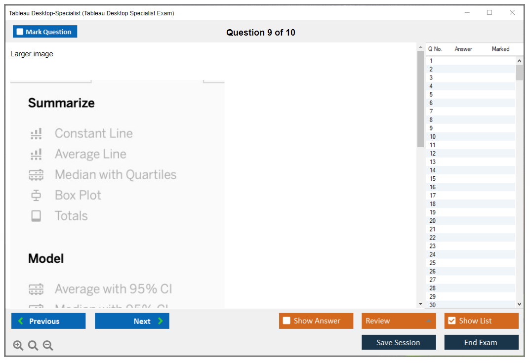 The Tableau Desktop Specialist Exam consists of 30 questions.