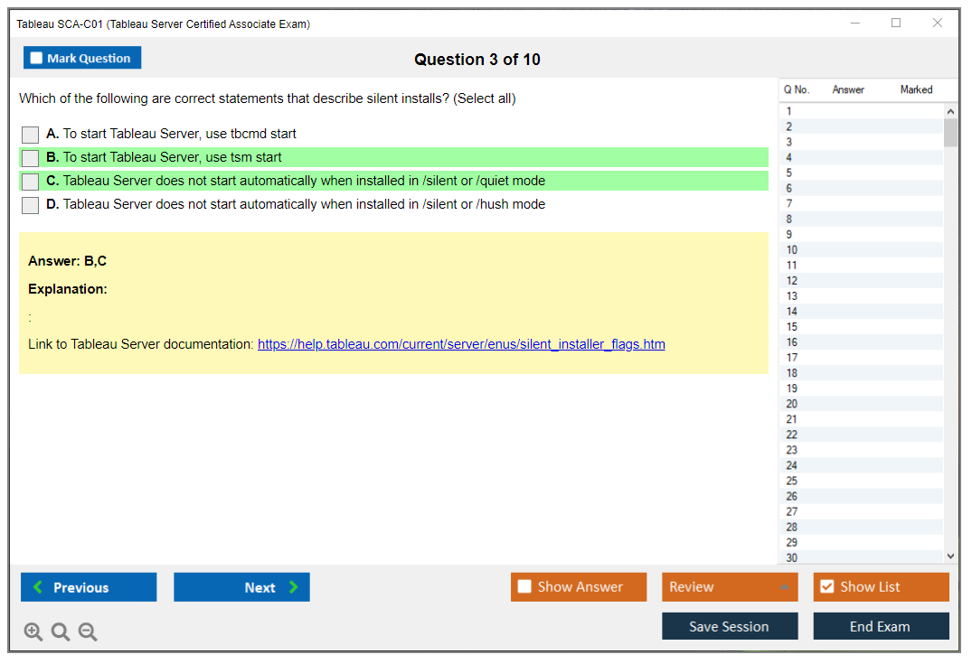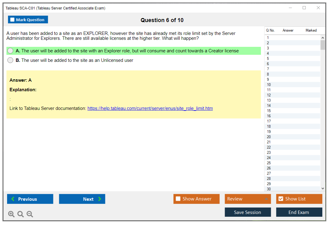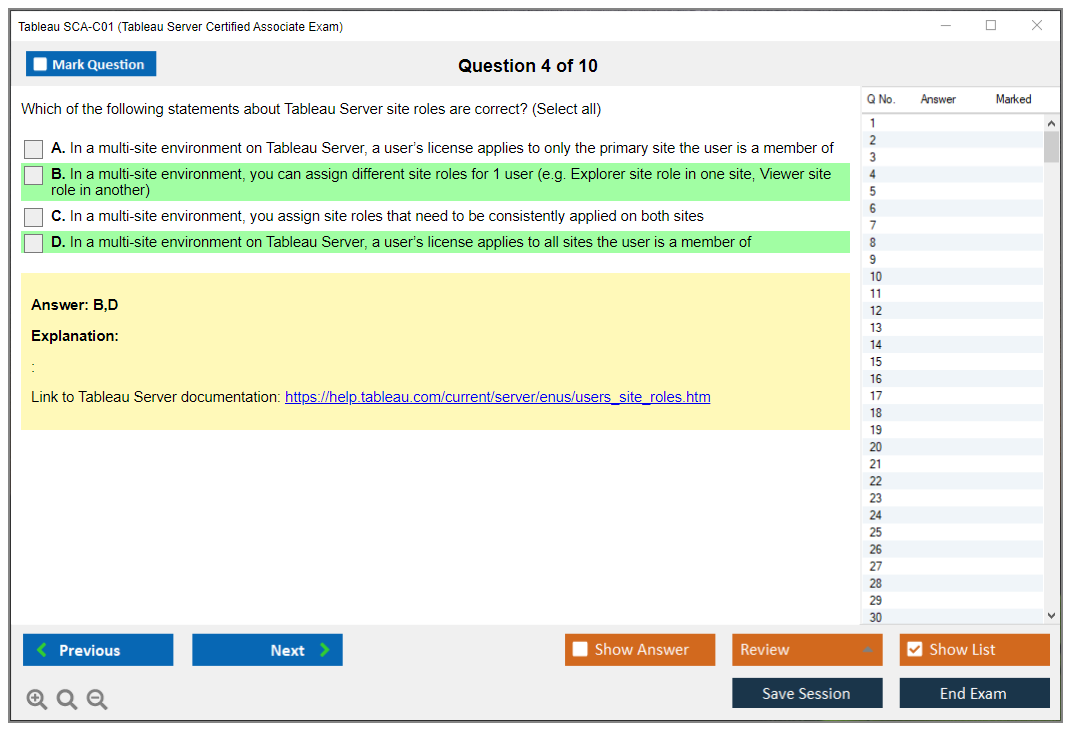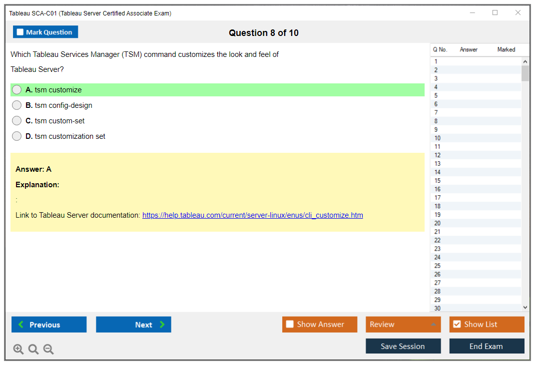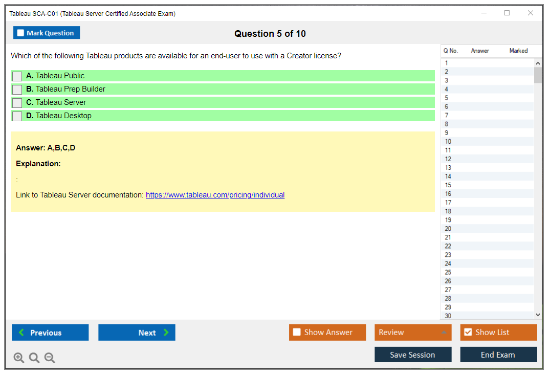 The Tableau SCA-C01 Exam consists of 55 multiple-choice questions.