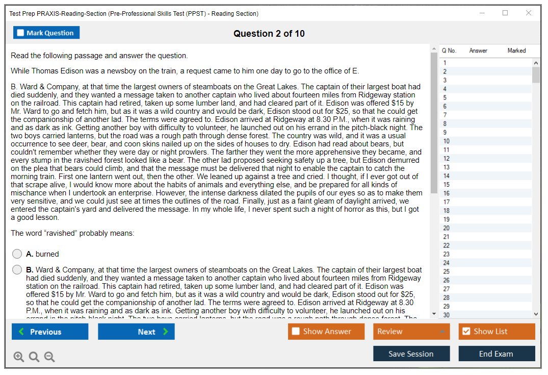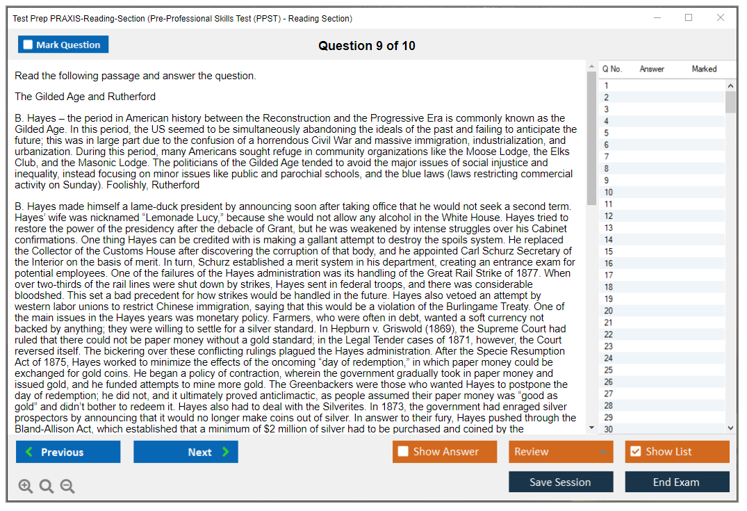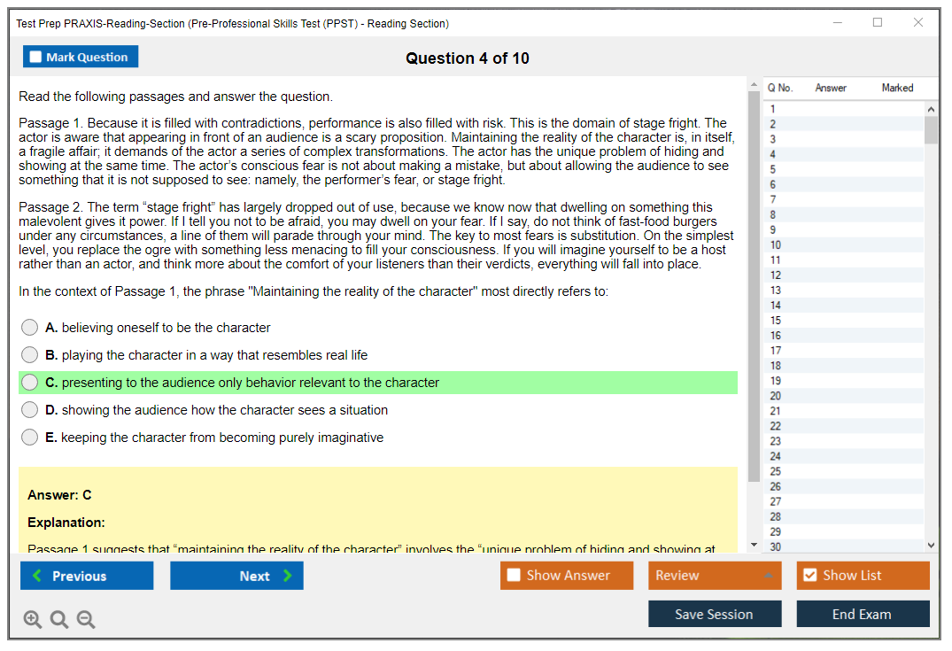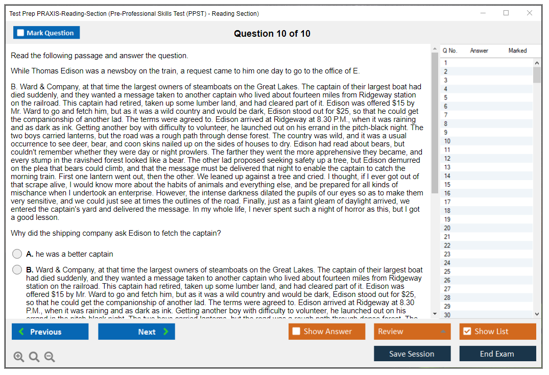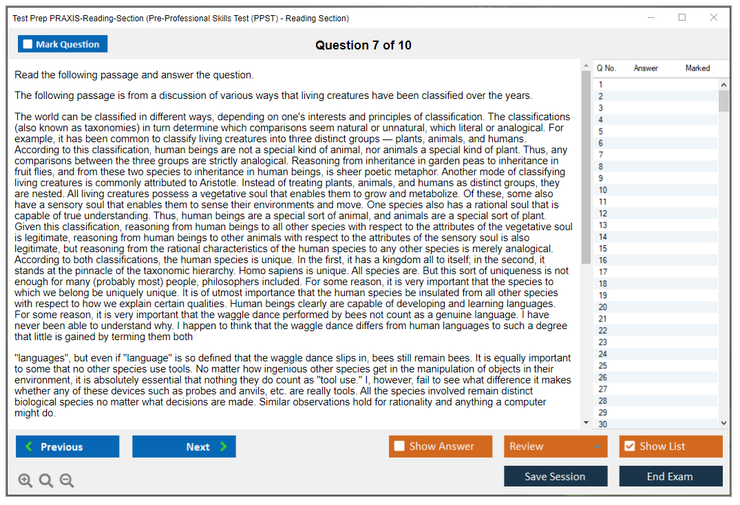The Test Prep PRAXIS-Reading-Section (Pre-Professional Skills Test (PPST) - Reading Section) Exam is designed to assess the reading comprehension and critical thinking skills of individuals who are preparing to enter the teaching profession. It is part of the PRAXIS series of exams which are used by many states and professional licensing organizations as part of the certification process for teachers.