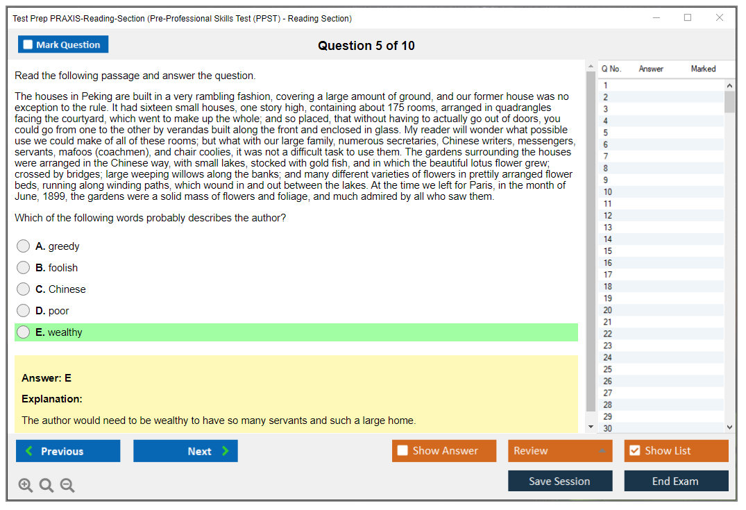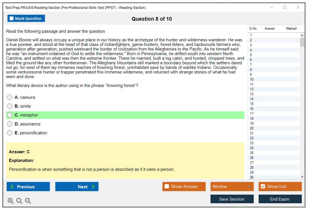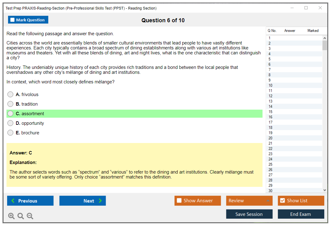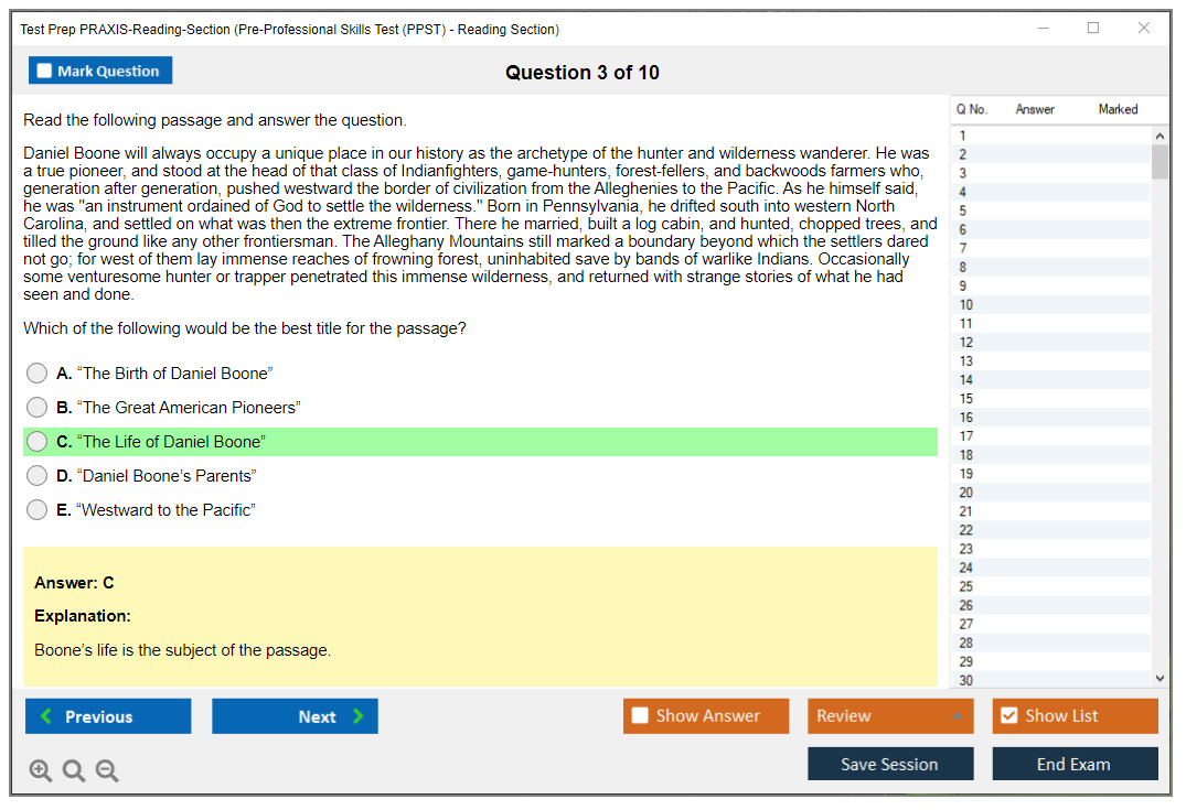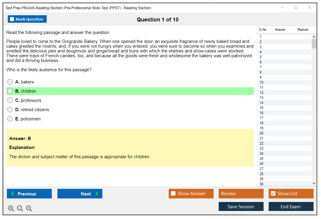 The Test Prep PRAXIS-Reading-Section (Pre-Professional Skills Test (PPST) - Reading Section) Exam is designed to assess the reading comprehension and critical thinking skills of individuals who are preparing to enter the teaching profession. It is part of the PRAXIS series of exams which are used by many states and professional licensing organizations as part of the certification process for teachers.