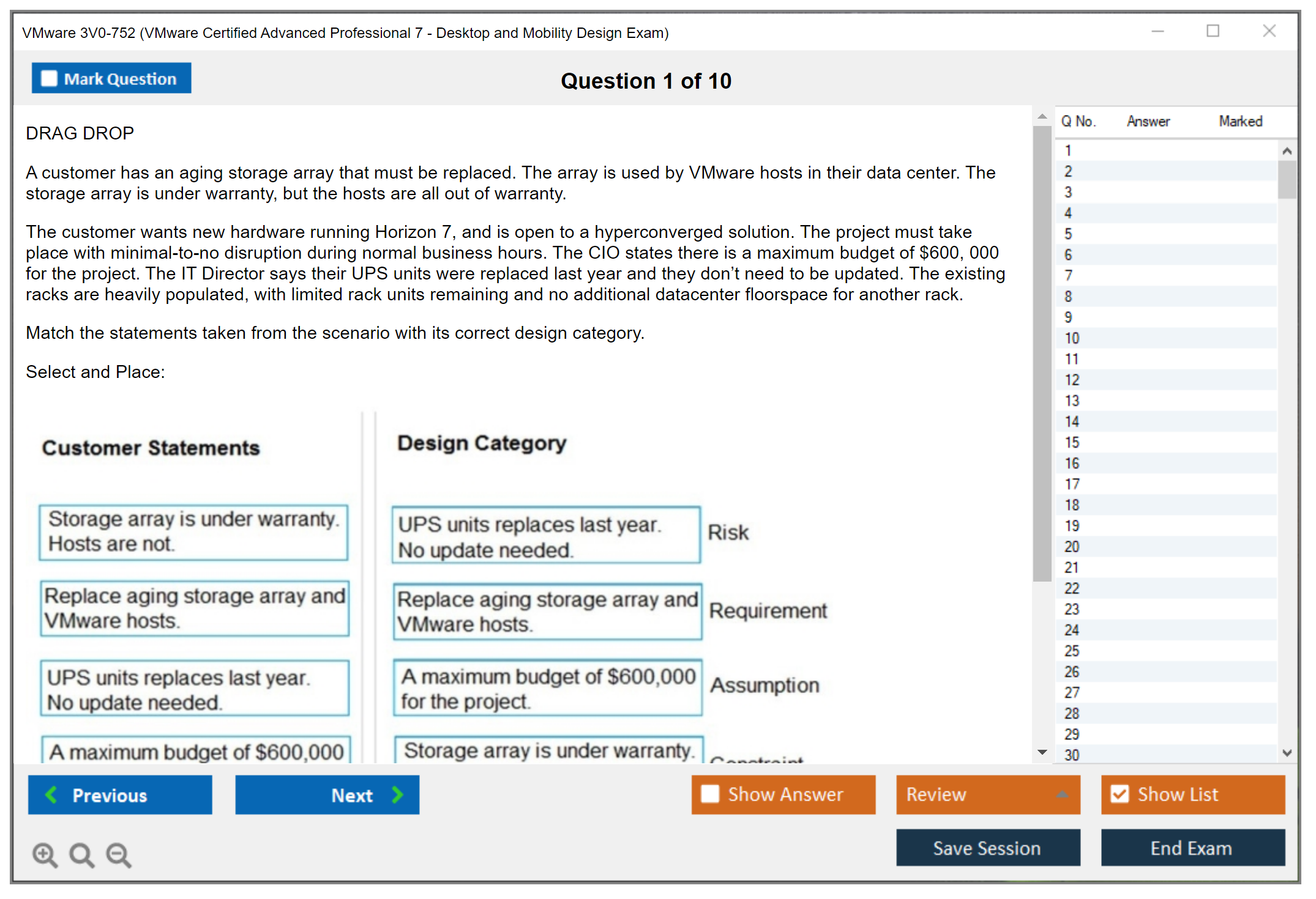 The question format of the VMware 3V0-752 exam includes multiple-choice, drag-and-drop, and design scenario-based questions.