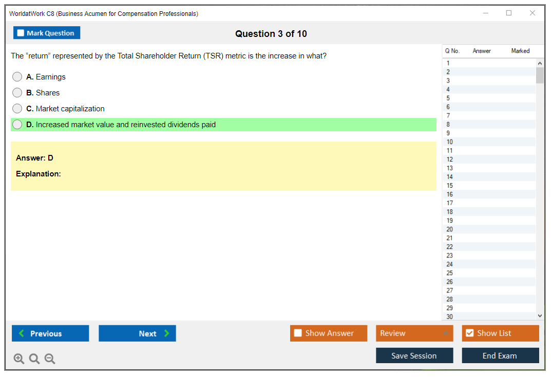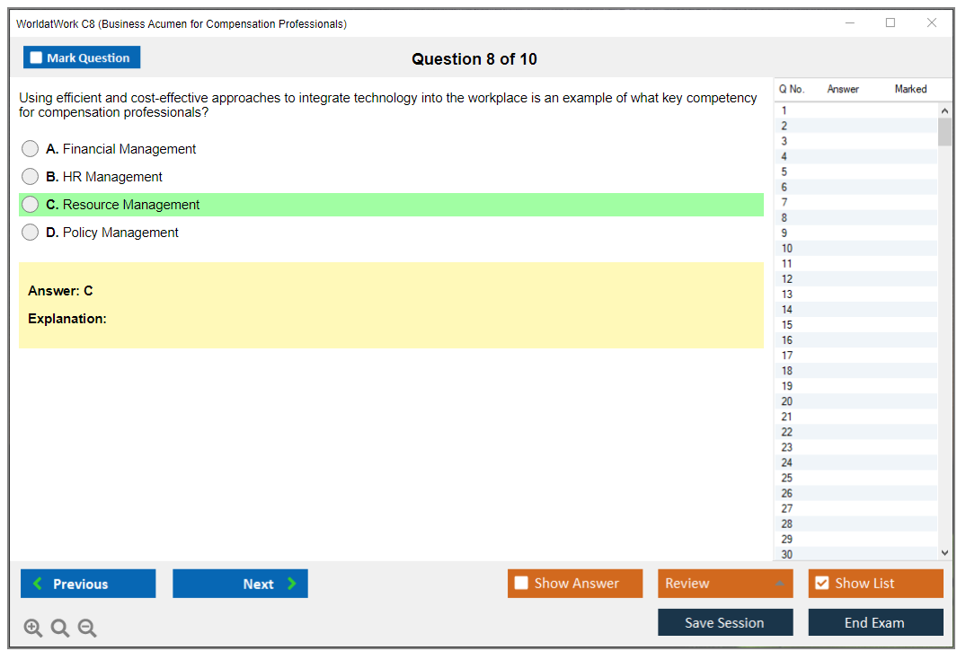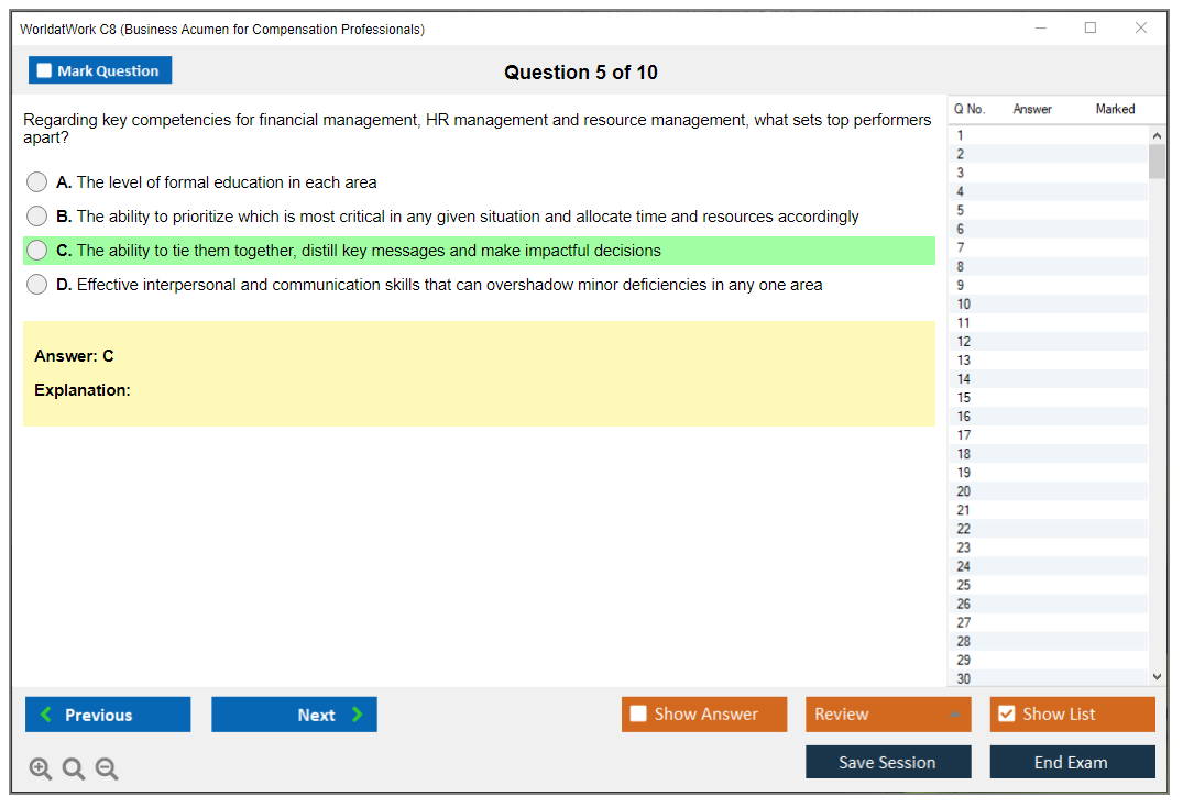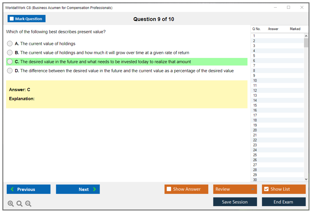 The WorldatWork C8 (Business Acumen for Compensation Professional) Exam is designed to test the knowledge and skills of compensation professionals in understanding and applying business acumen in their roles.