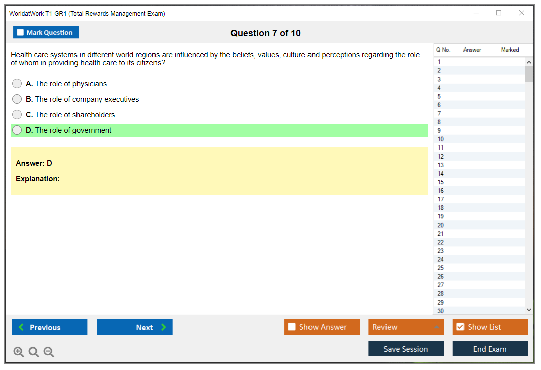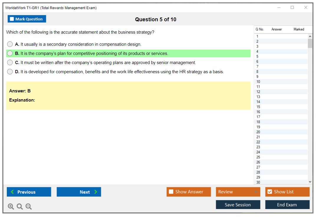 The question format of the WorldatWork T1-GR1 Exam is multiple-choice.